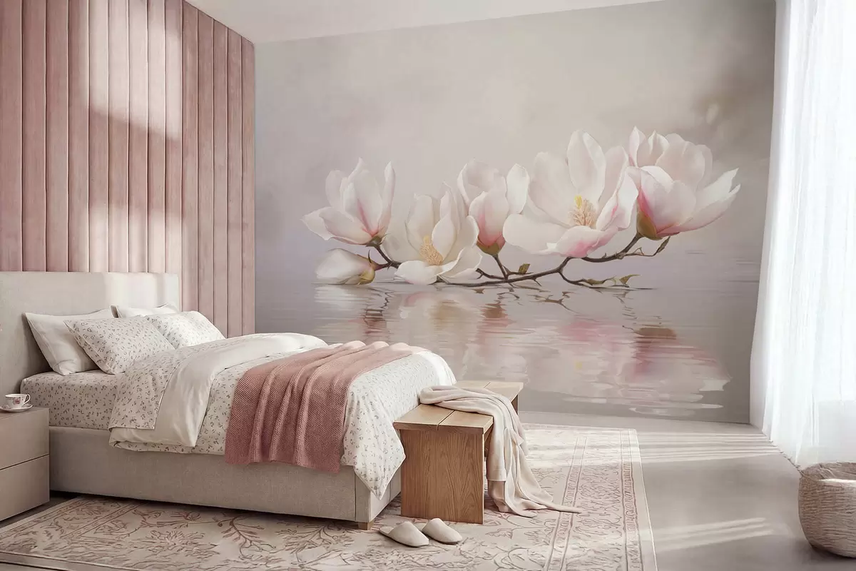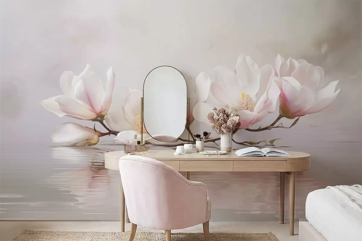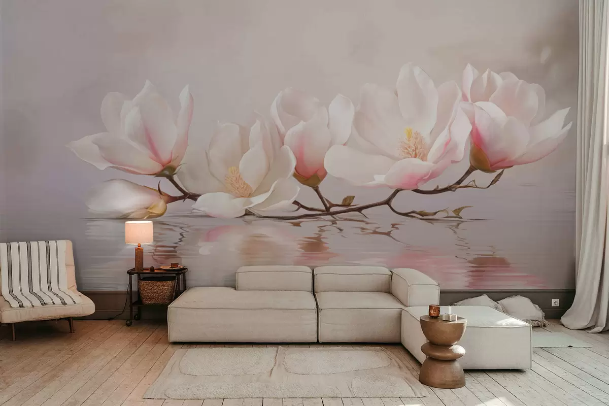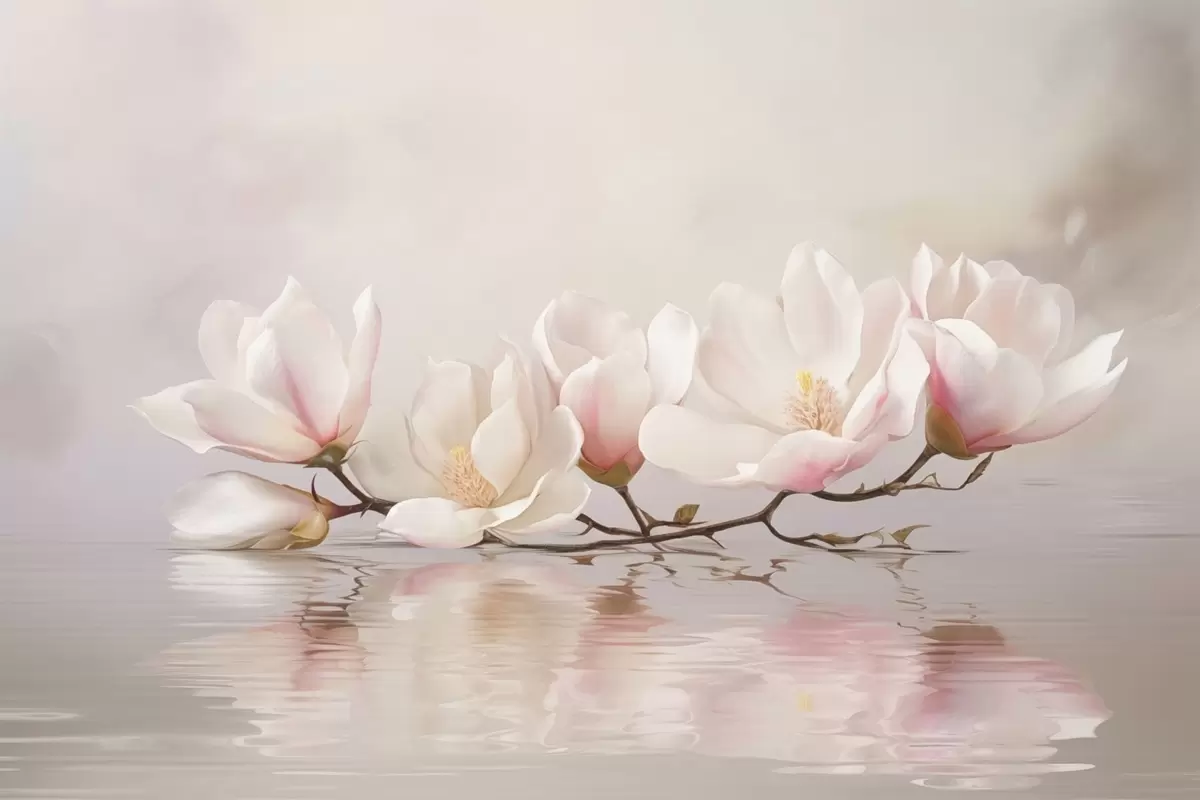 Murais de parede Ramo de magnólia com flores acima do reflexo da água calma Nr. w05353v1