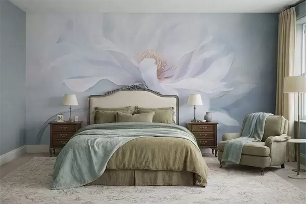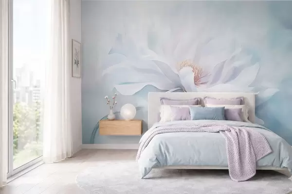 Murais de parede Flor branca suave com pétalas esvoaçantes sobre fundo azul Nr. w05354