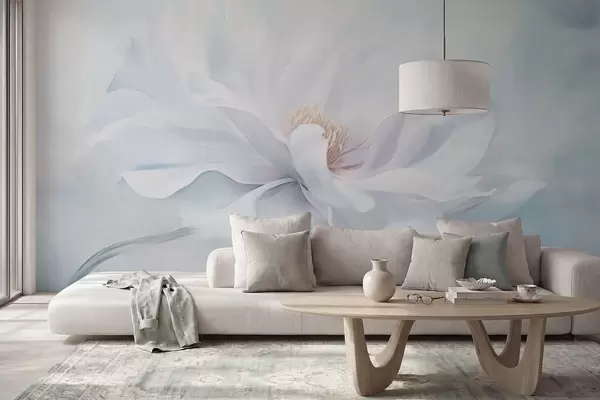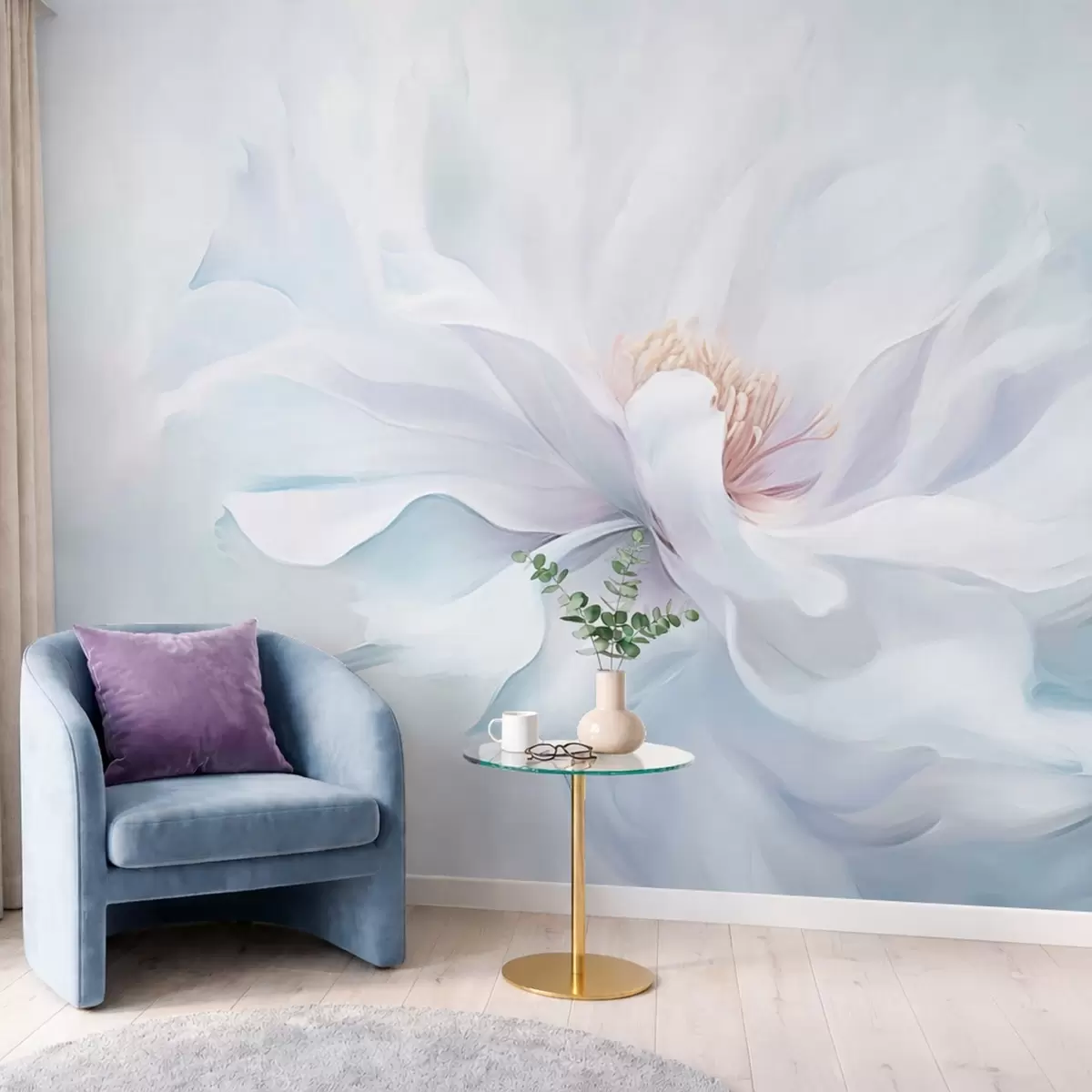 Murais de parede Flor branca suave com pétalas esvoaçantes sobre fundo azul Nr. w05354