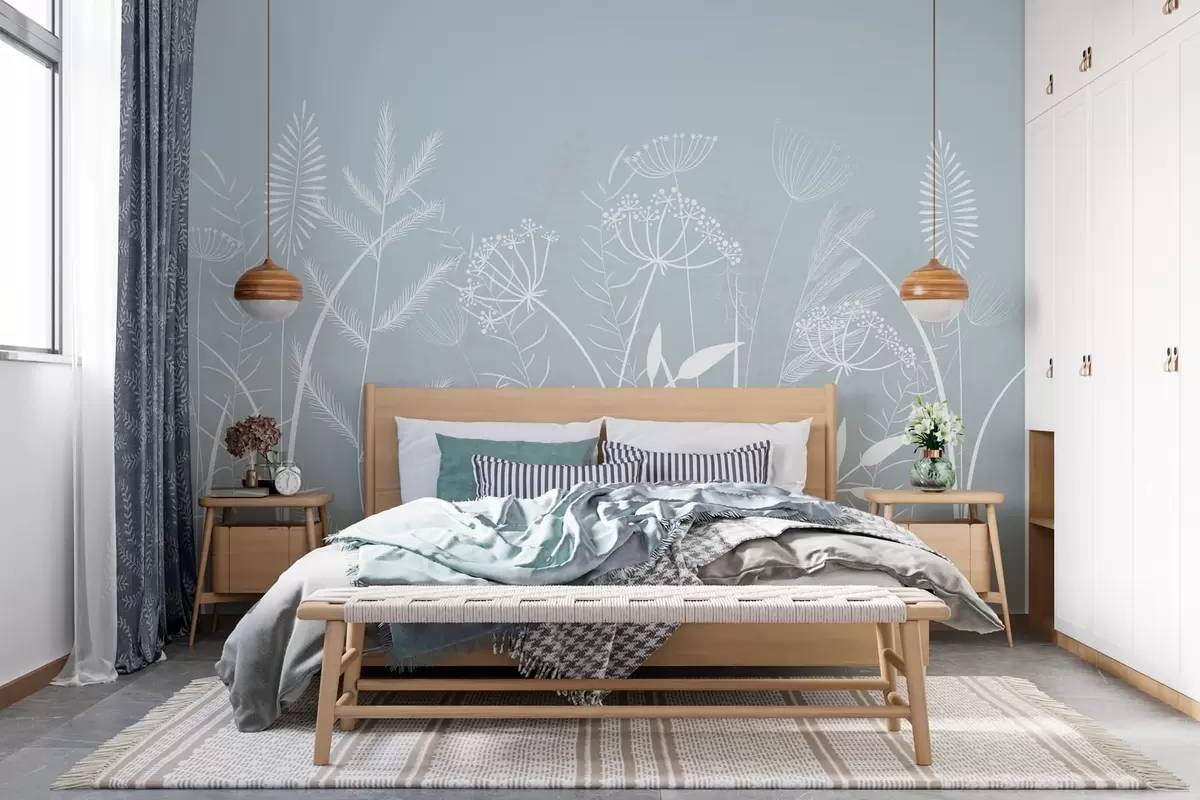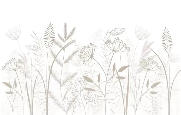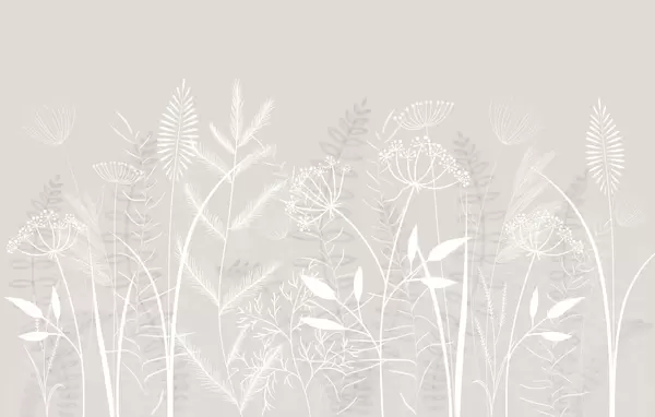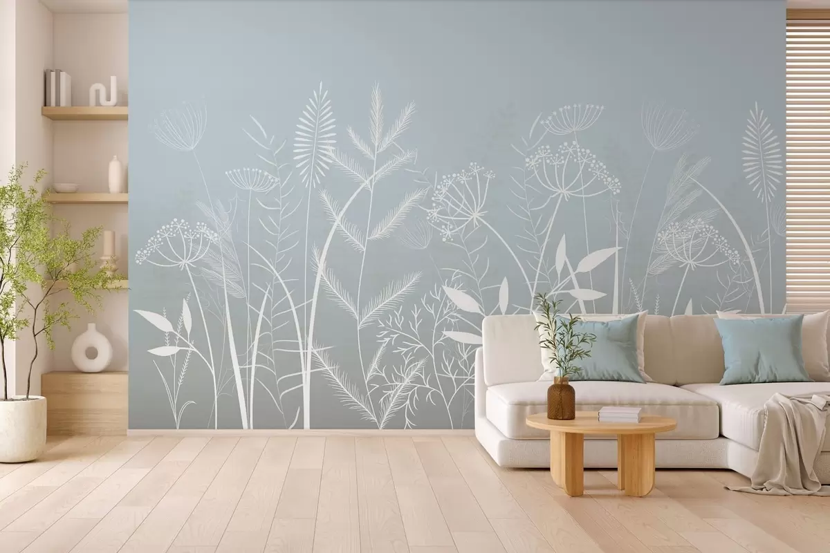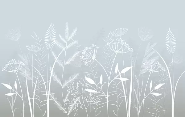 Murais de parede delicadas ervas silvestres e flores pintadas à mão sobre um fundo cinzento-azulado Nr. w05383