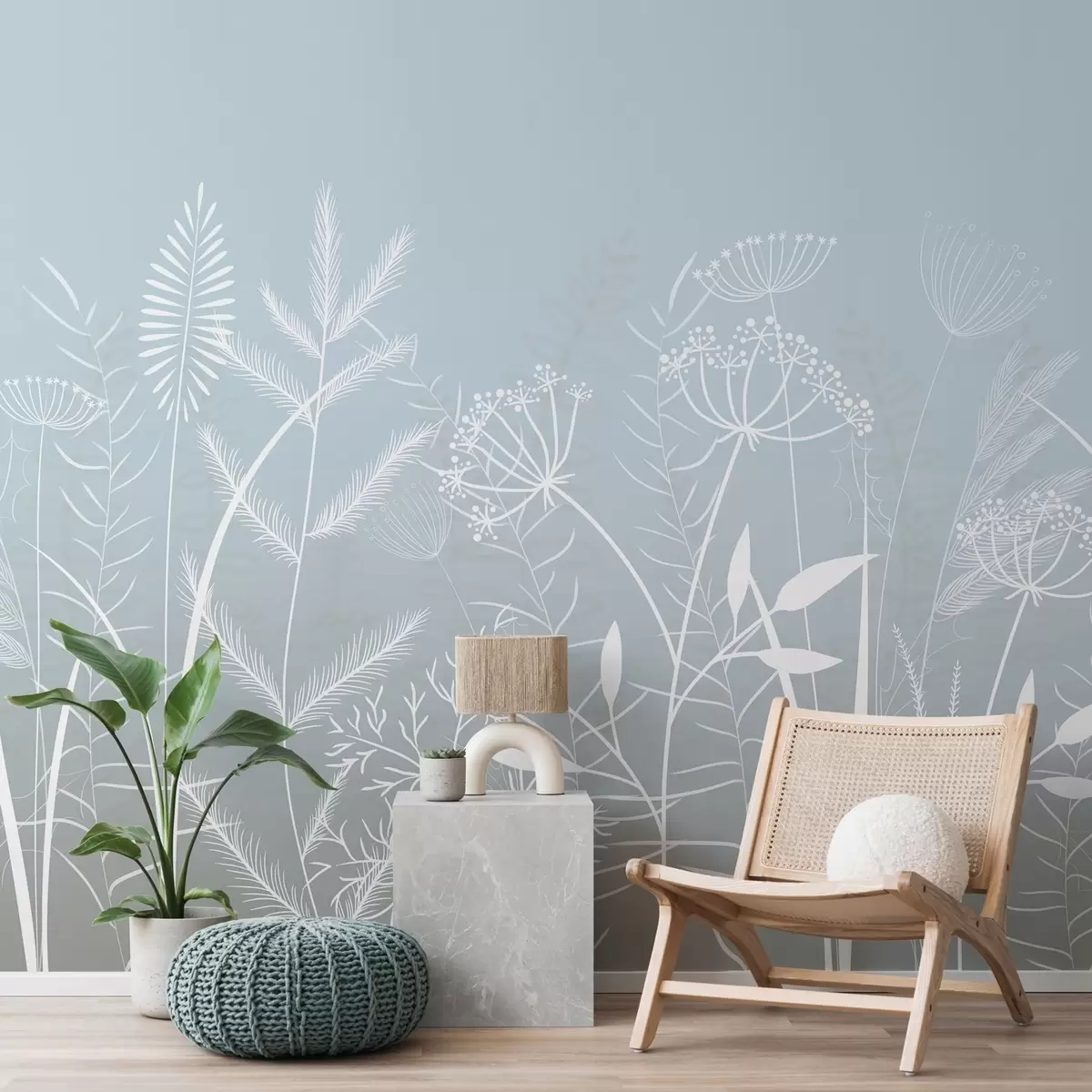 Murais de parede delicadas ervas silvestres e flores pintadas à mão sobre um fundo cinzento-azulado Nr. w05383