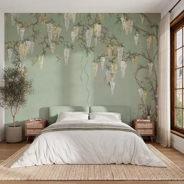 Murais de parede Ramos floridos com flores brancas e pássaros sobre um fundo verde Nr. w05394