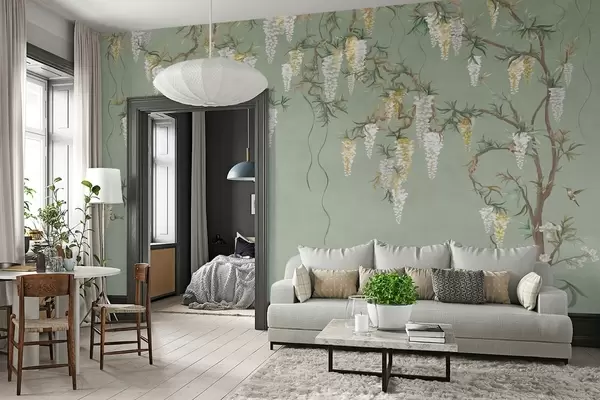 Murais de parede Ramos floridos com flores brancas e pássaros sobre um fundo verde Nr. w05394