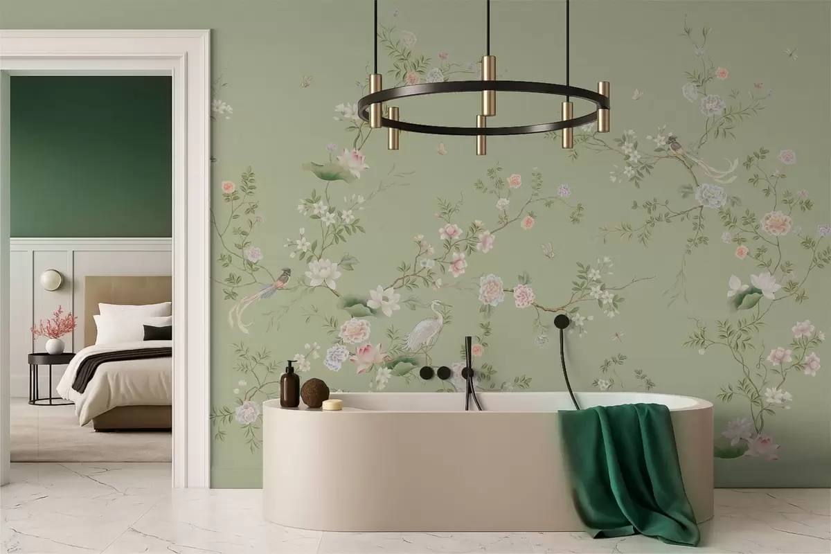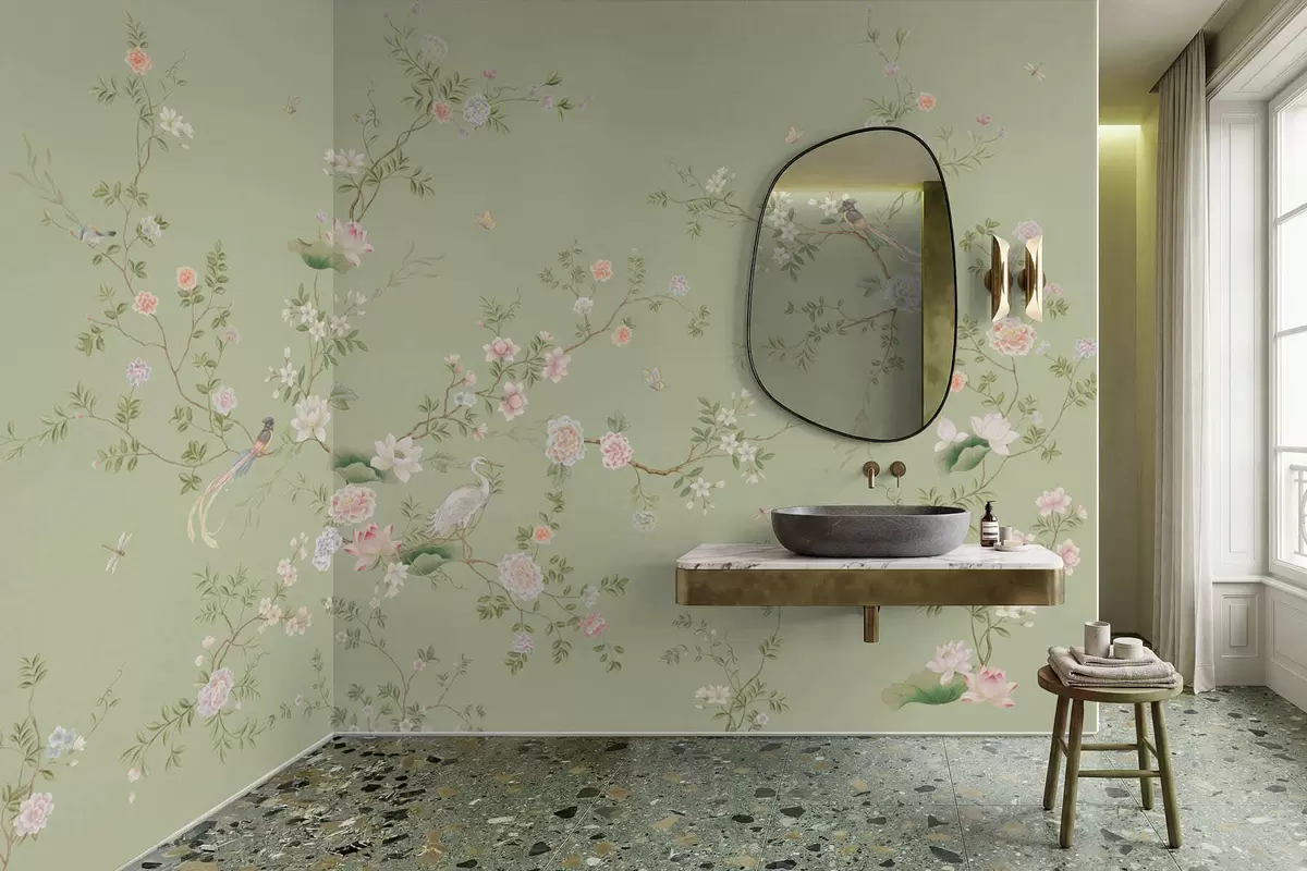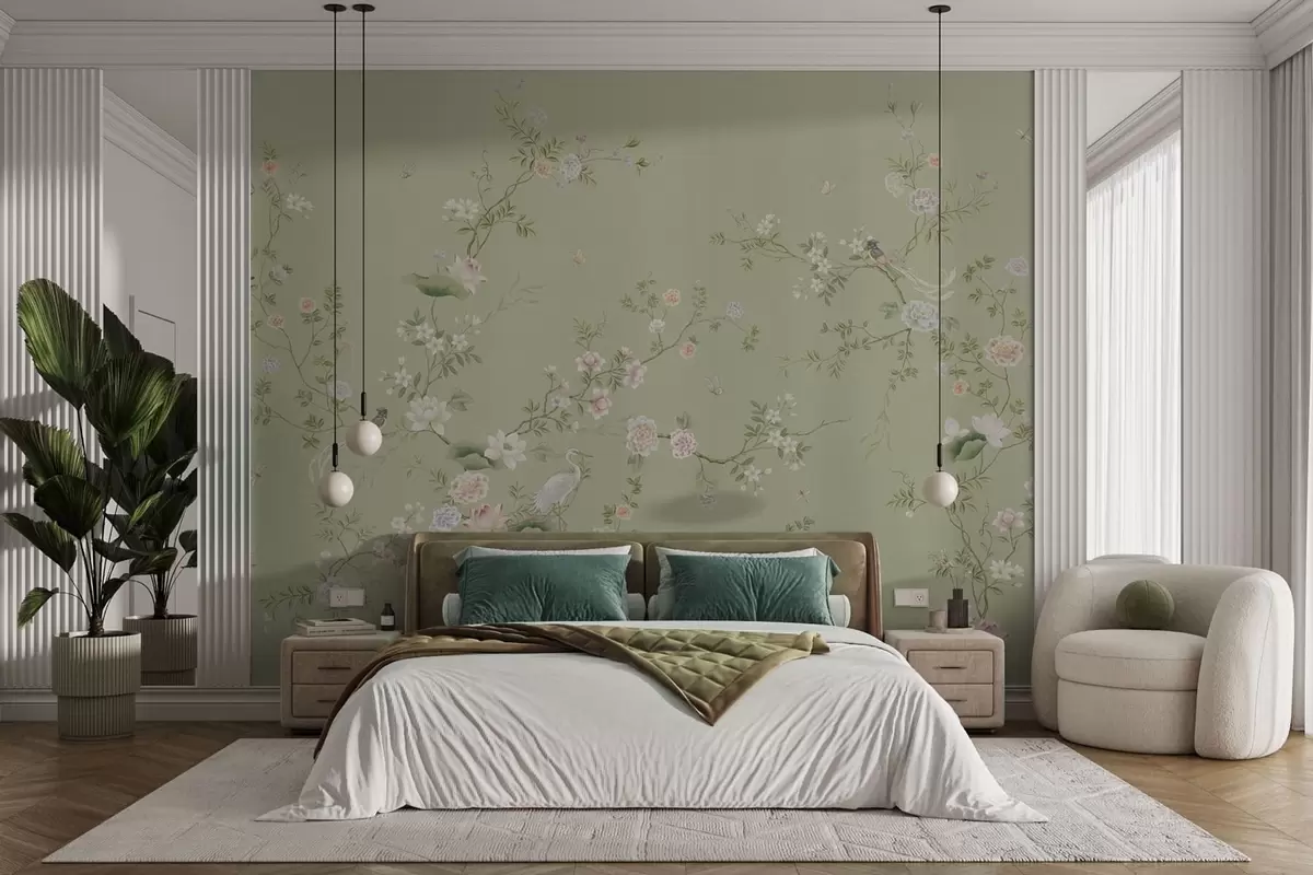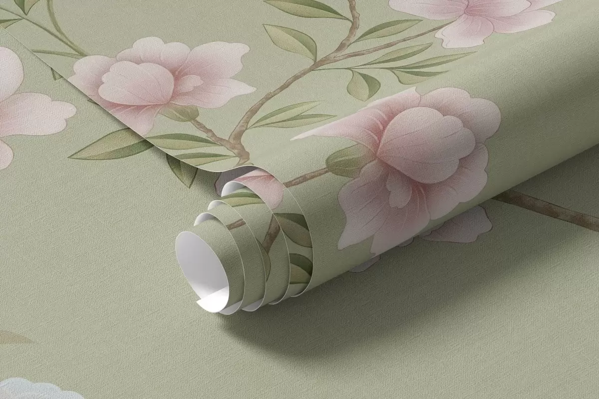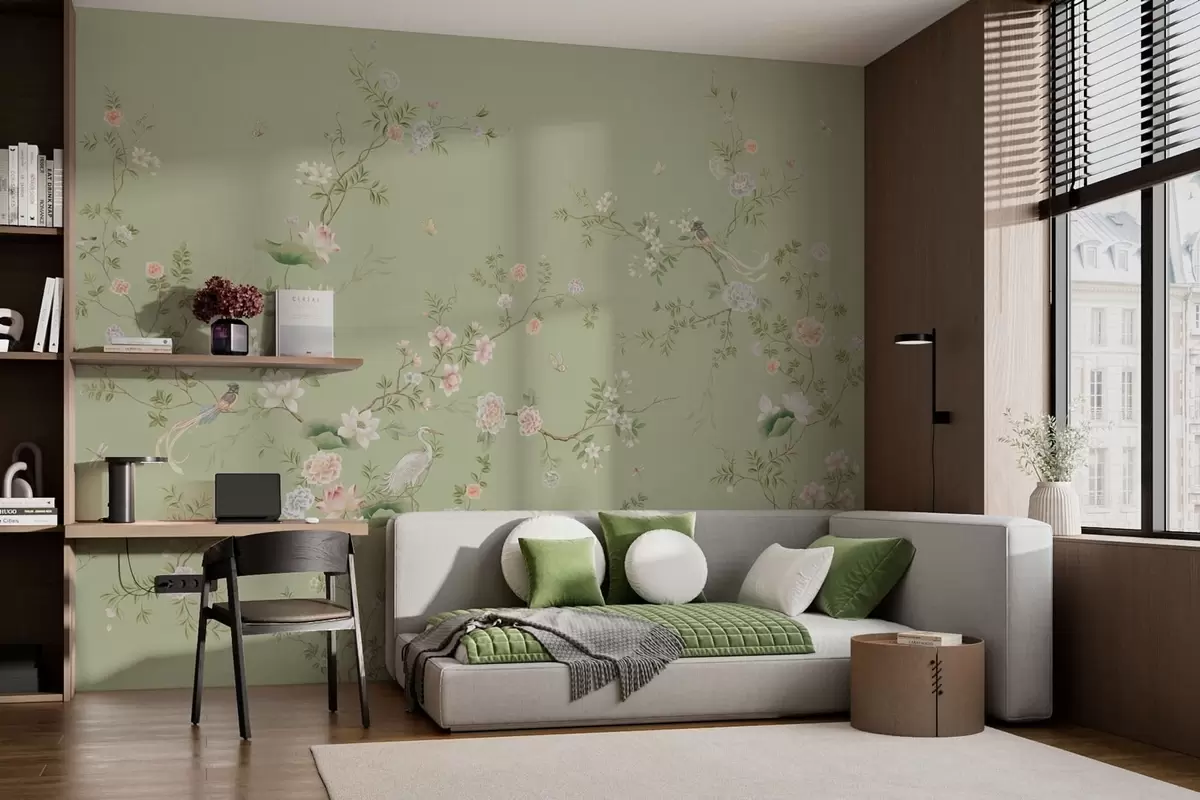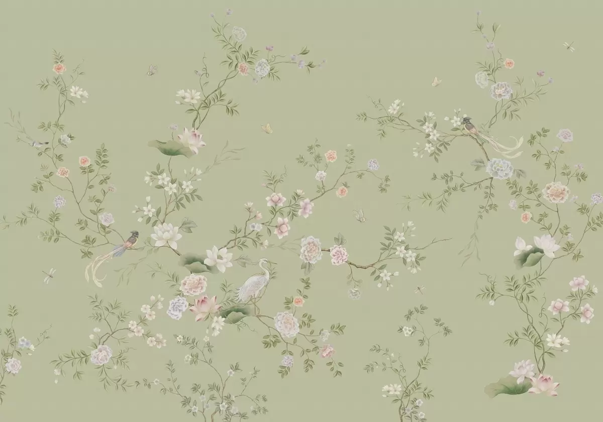 Murais de parede Ramos floridos com pássaros sobre um fundo verde claro Nr. w05416