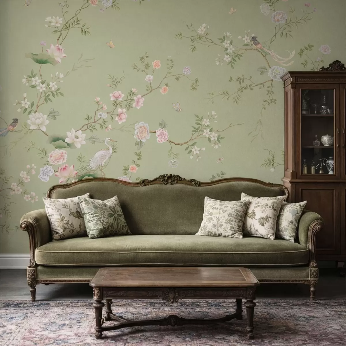 Murais de parede Ramos floridos com pássaros sobre um fundo verde claro Nr. w05416