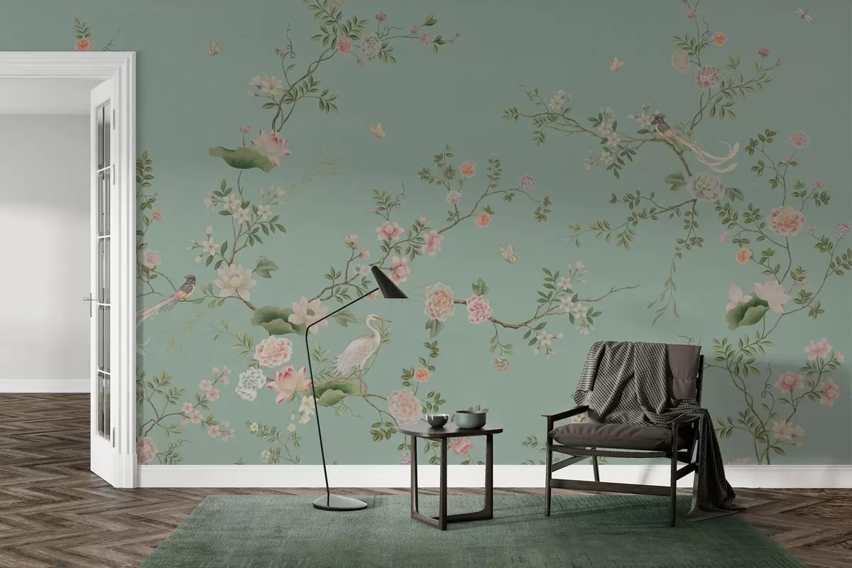 Murais de parede Ramos floridos com pássaros sobre fundo azul Nr. w05416v1