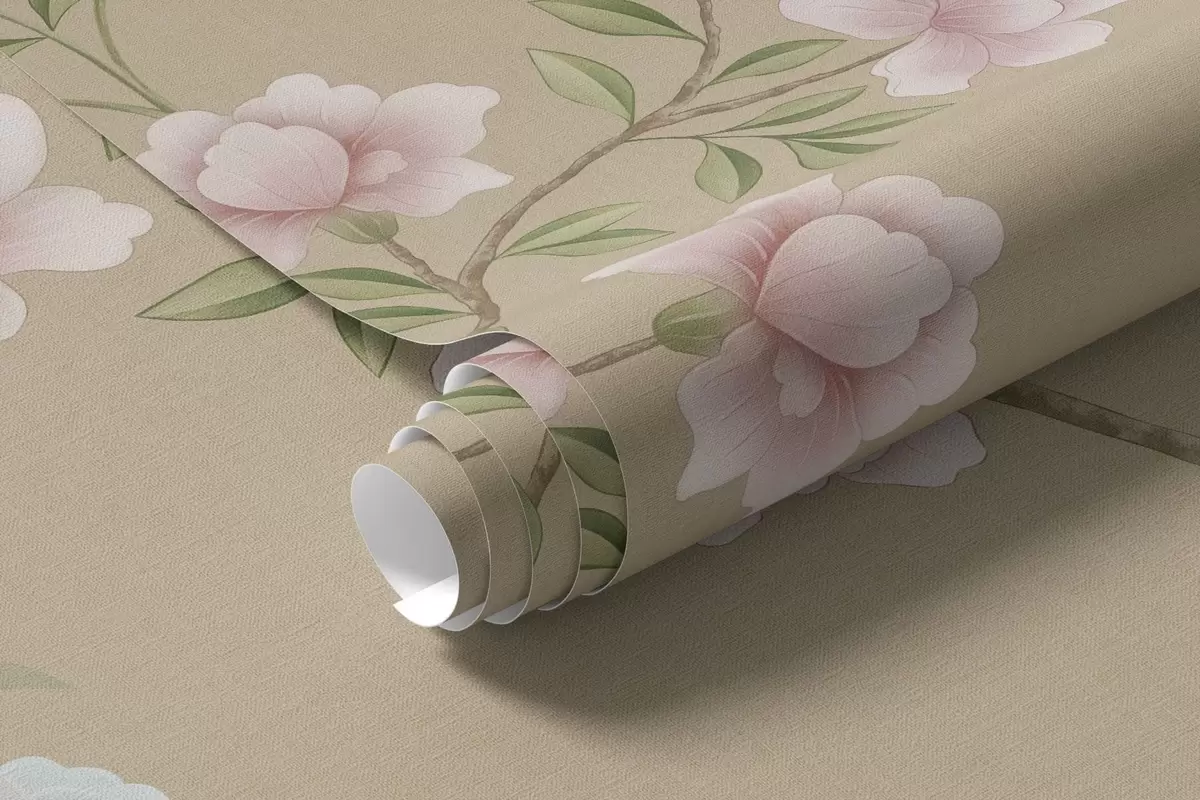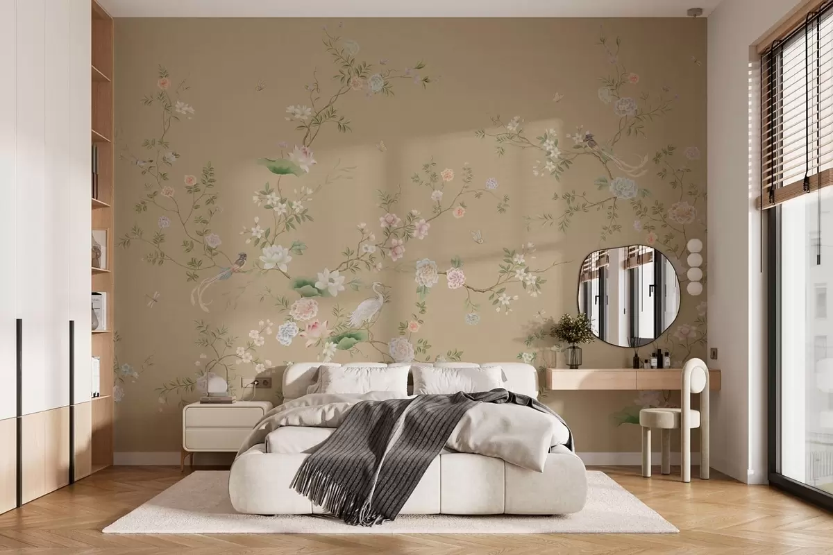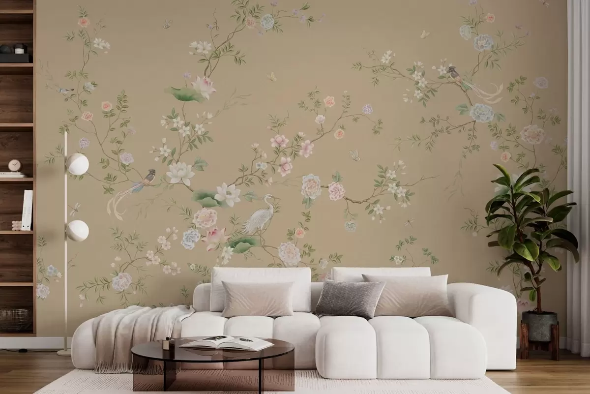 Murais de parede Ramos floridos com pássaros sobre um fundo bege quente Nr. w05416v2