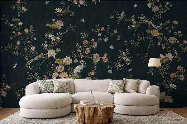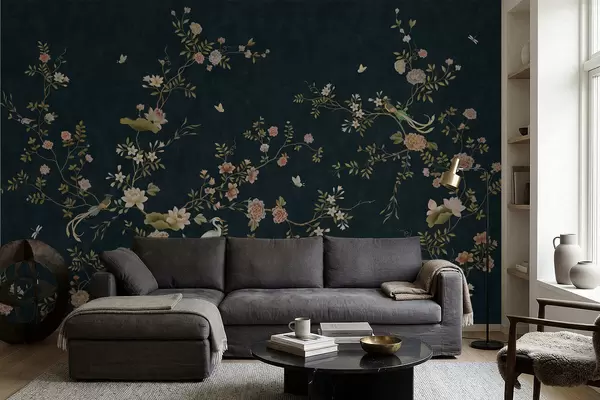Murais de parede Ramos floridos com pássaros sobre um fundo escuro Nr. w05416v3