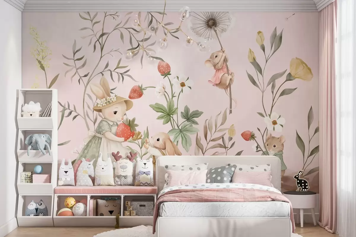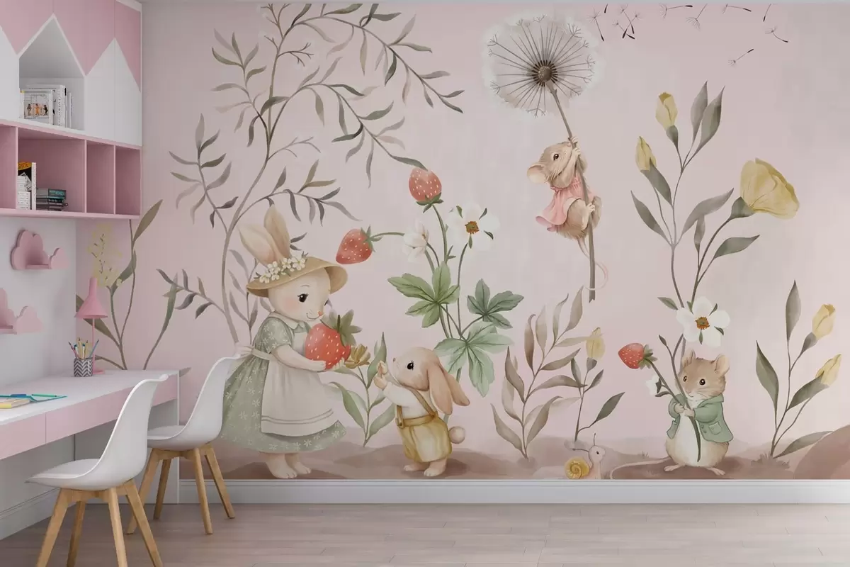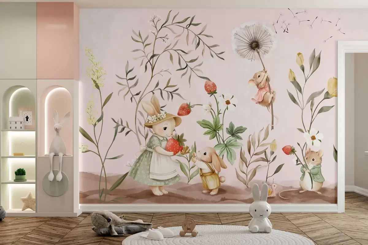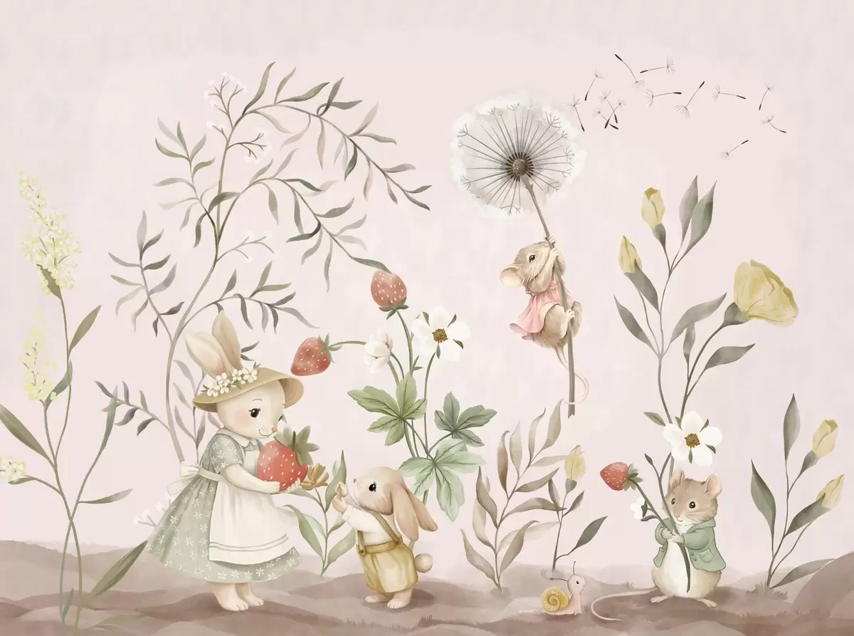 Murais de parede Ilustração de animais com morangos sobre um fundo rosa claro Nr. w05422v1