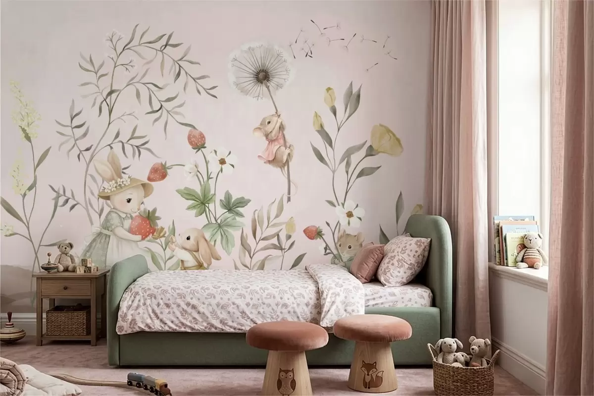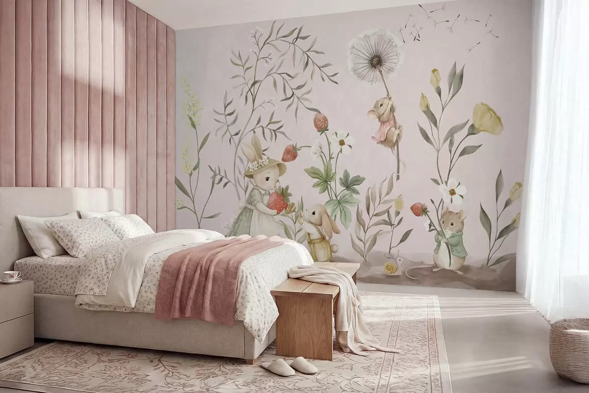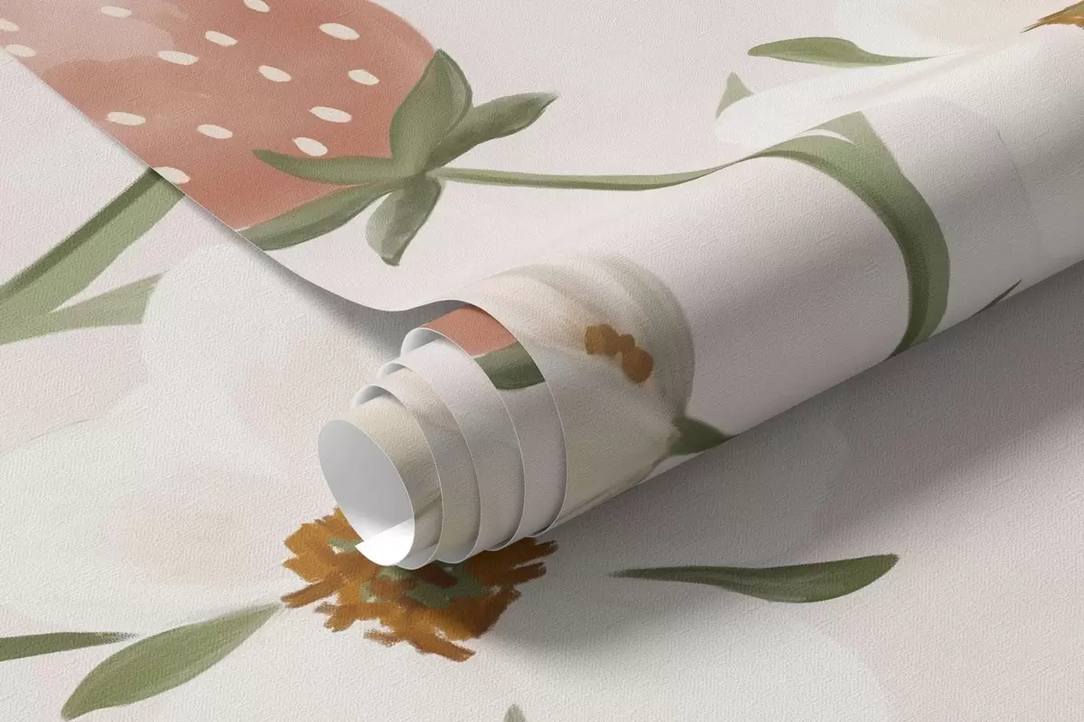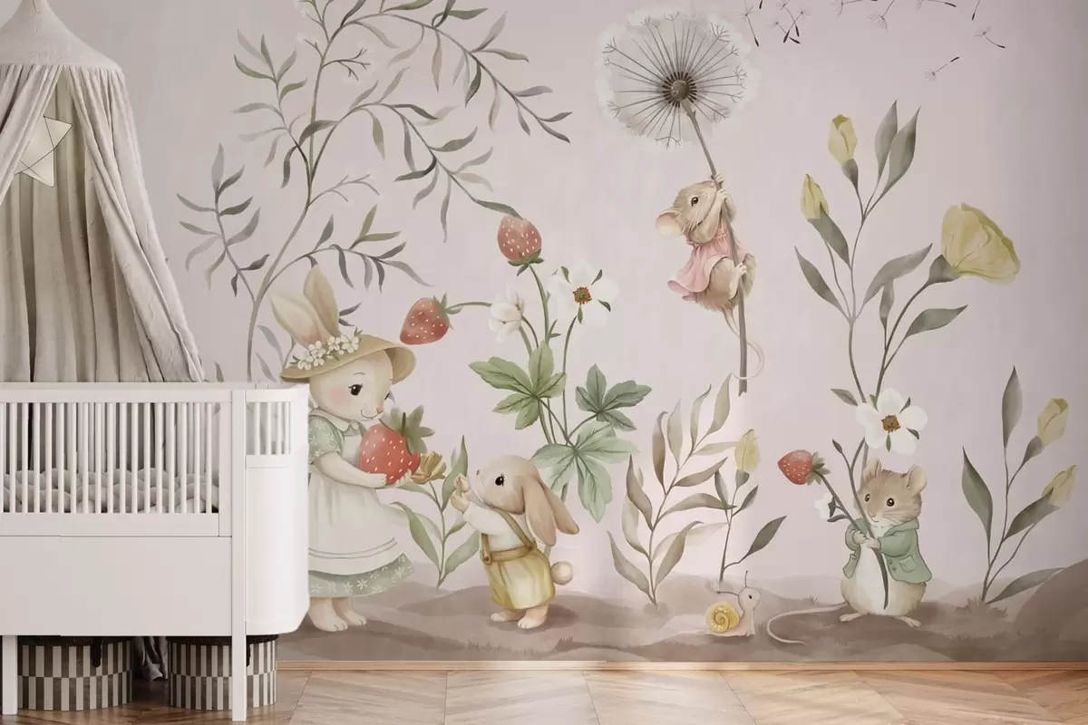 Murais de parede Ilustração de animais com morangos sobre um fundo rosa claro Nr. w05422v1