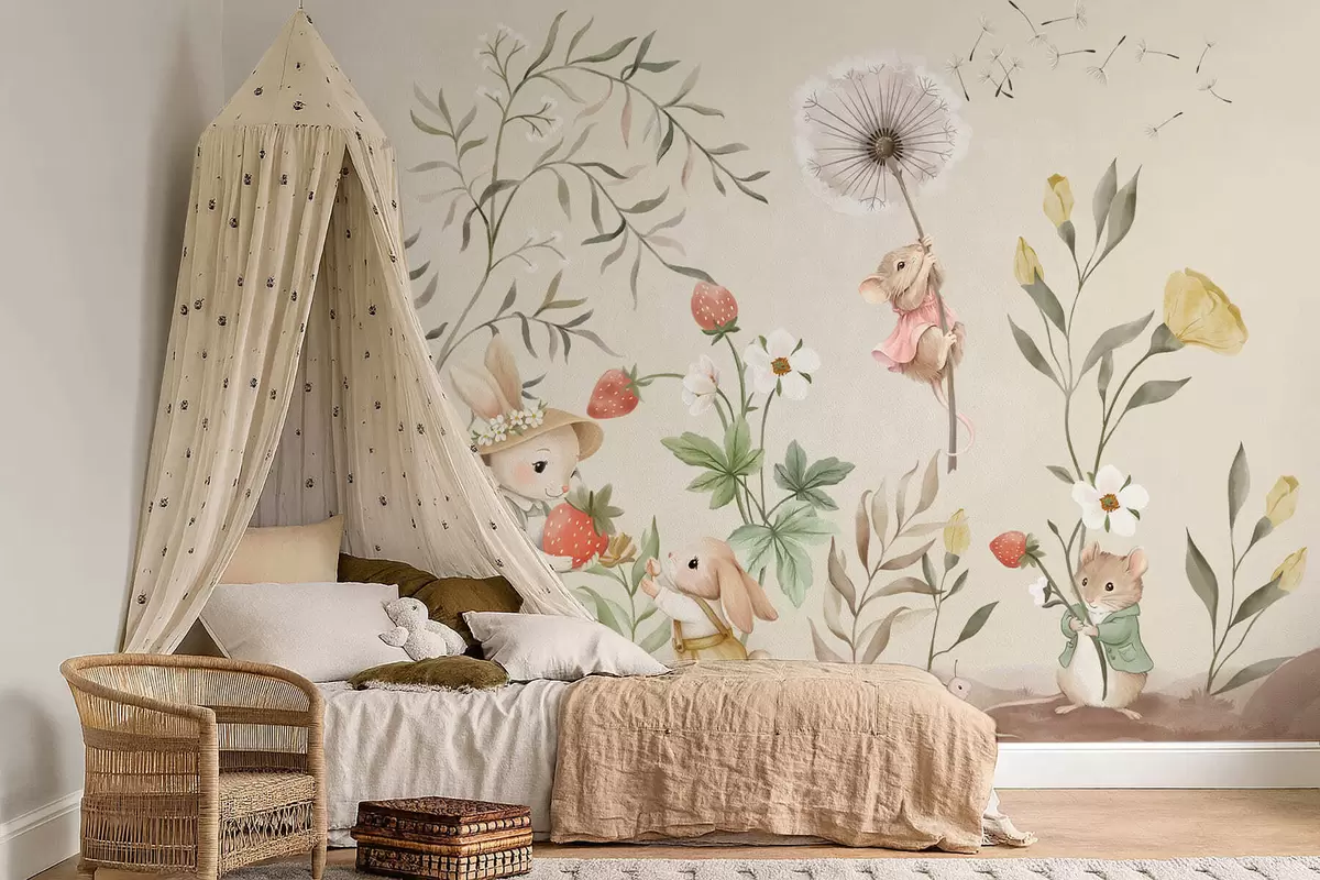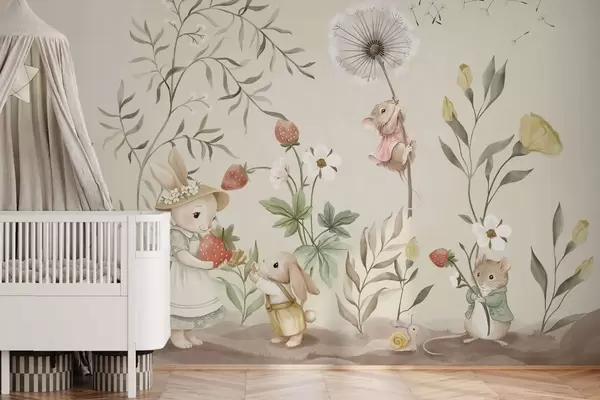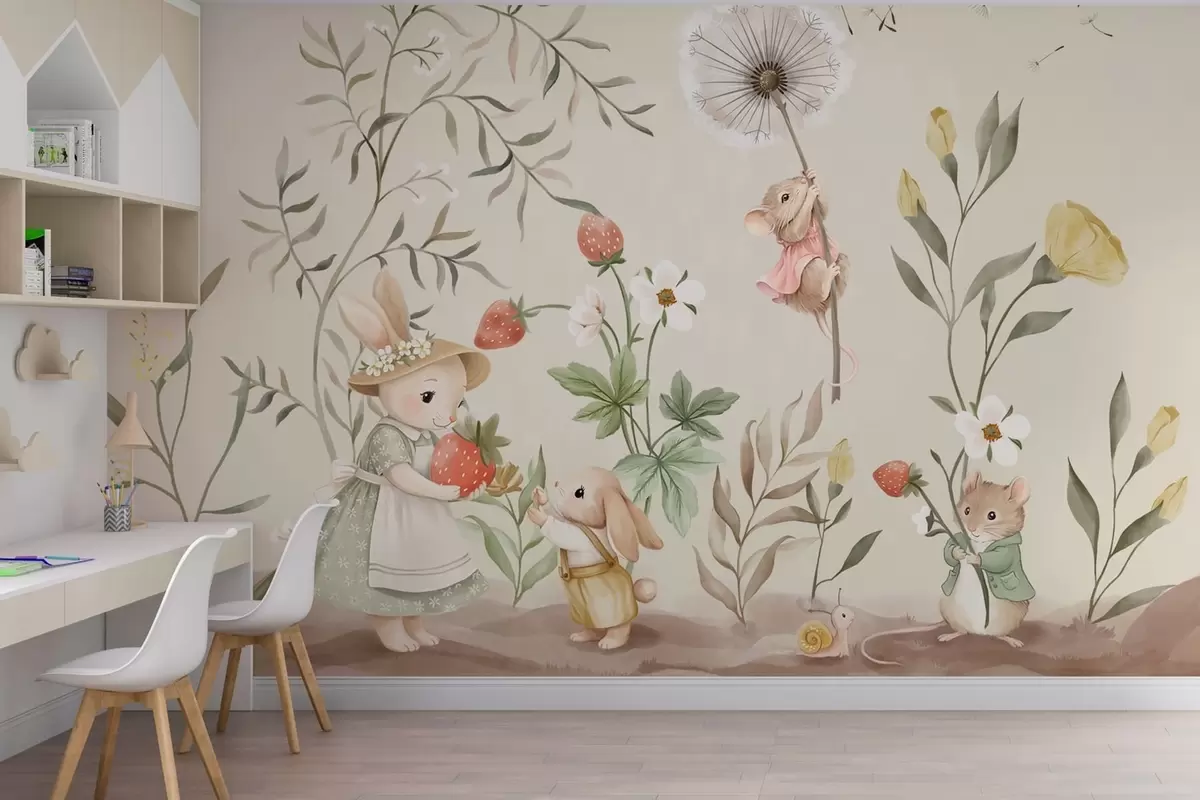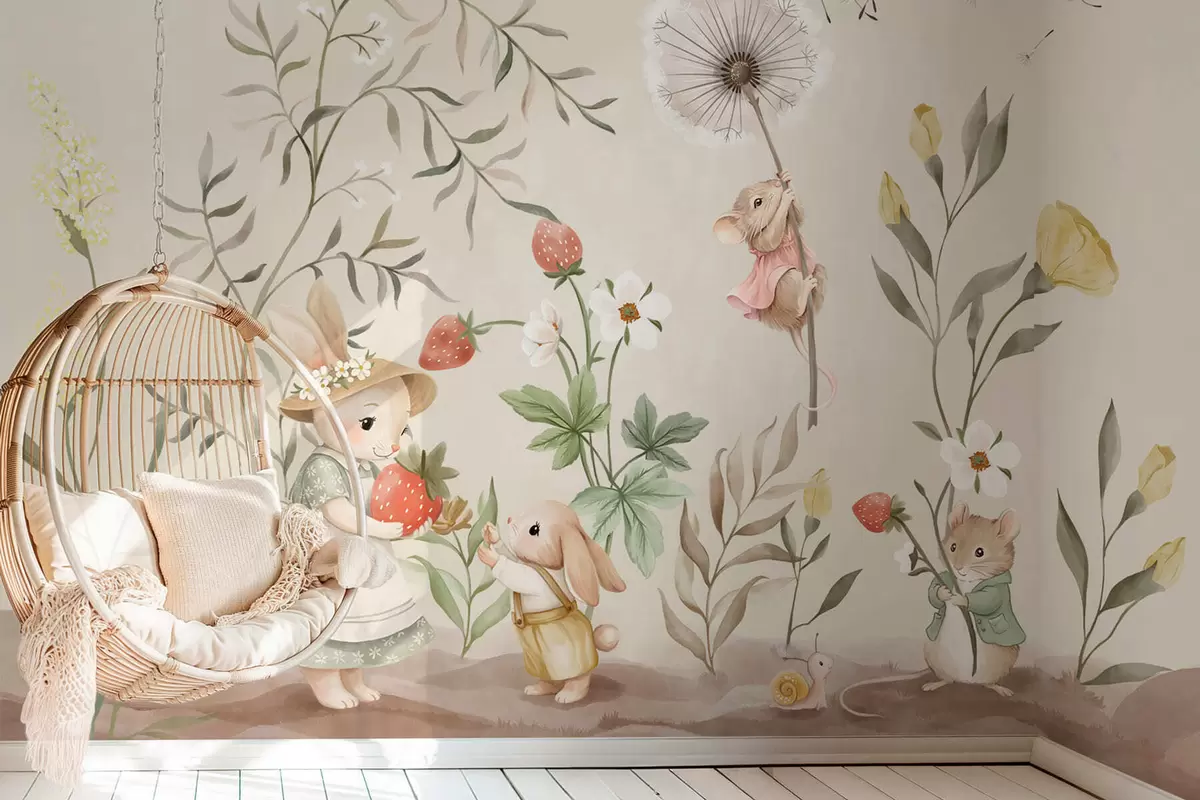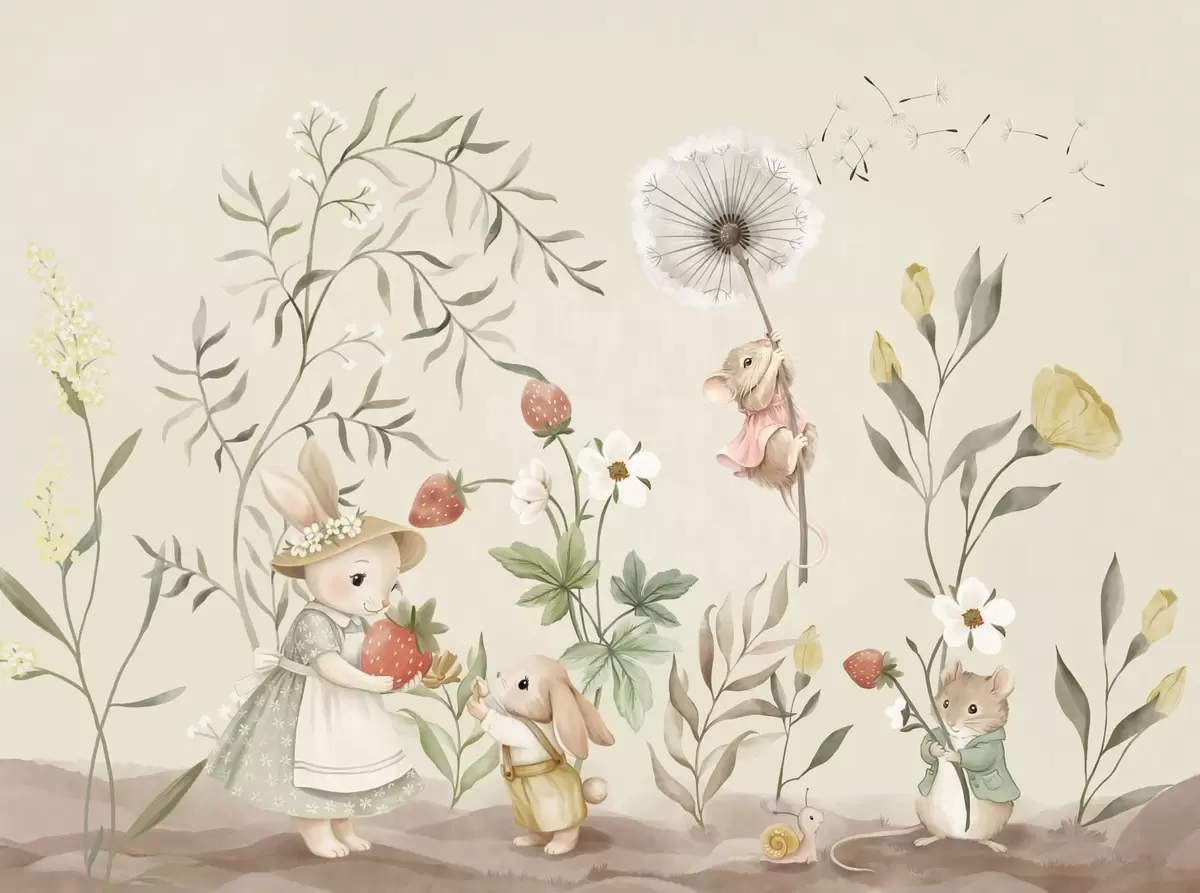 Murais de parede Ilustração de um coelho, um rato e plantas com morangos Nr. w05422v2