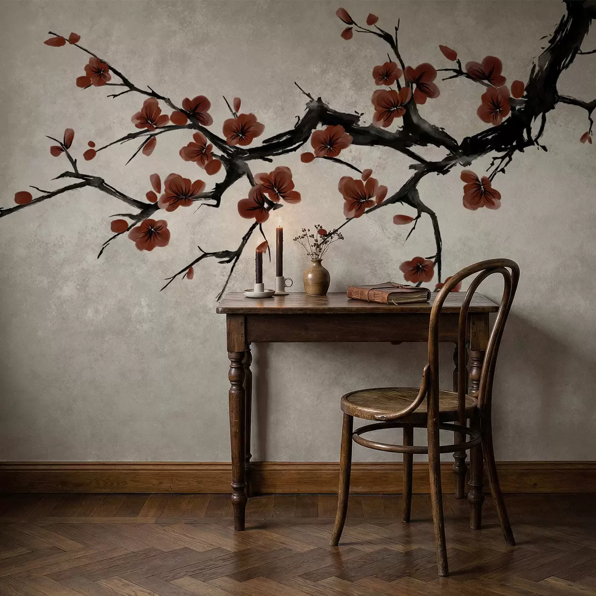 Murais de parede Ramo com flores vermelho-escuras sobre fundo neutro Nr. w05425v1