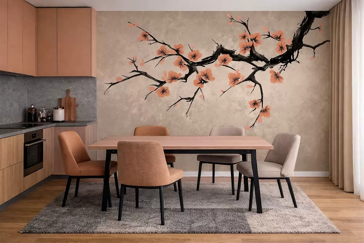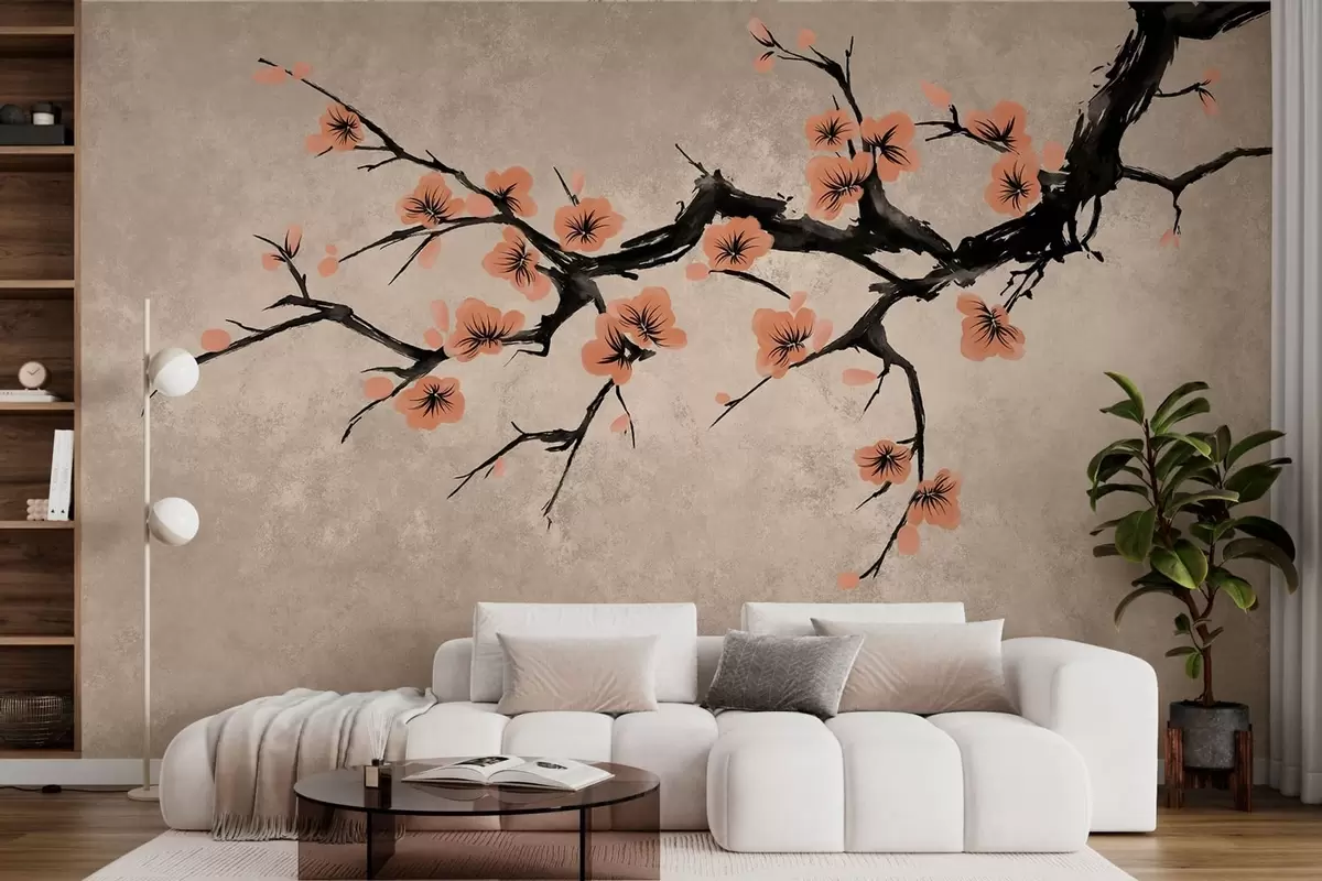 Murais de parede Ramo com flores de pessegueiro sobre um fundo texturado Nr. w05425v3