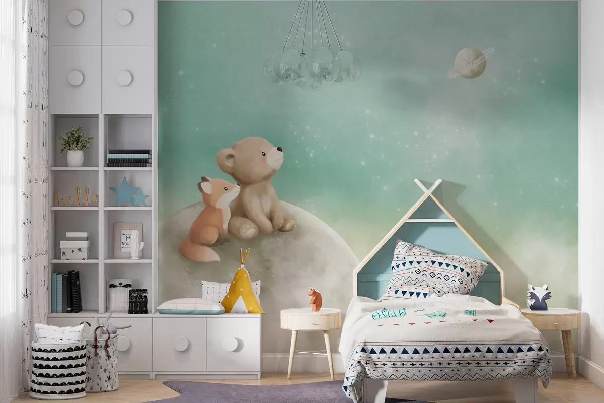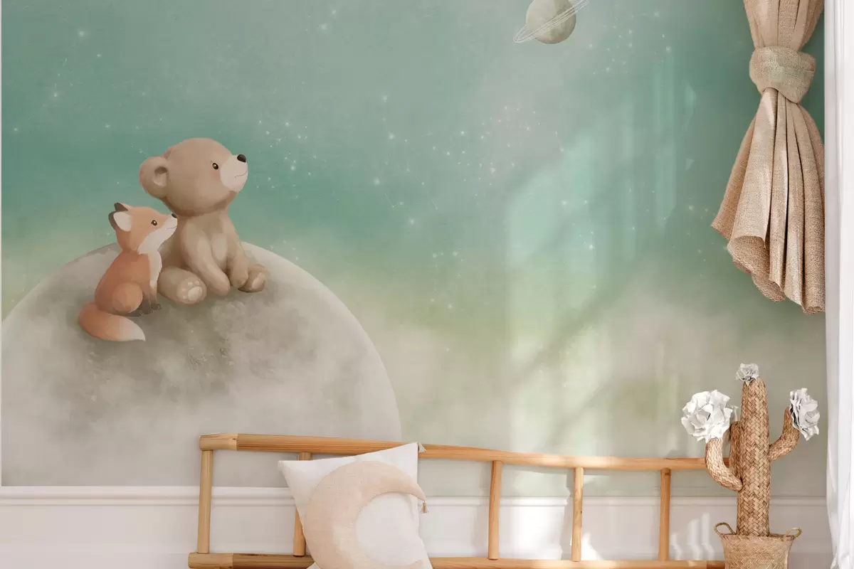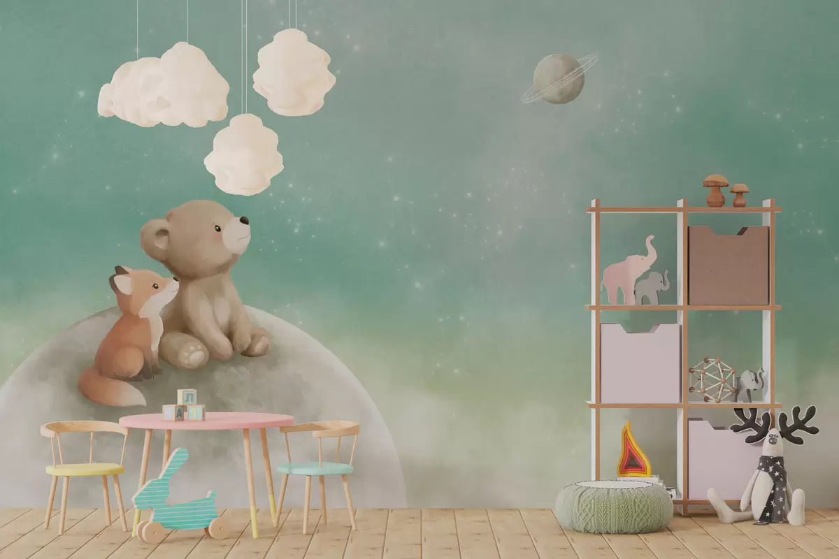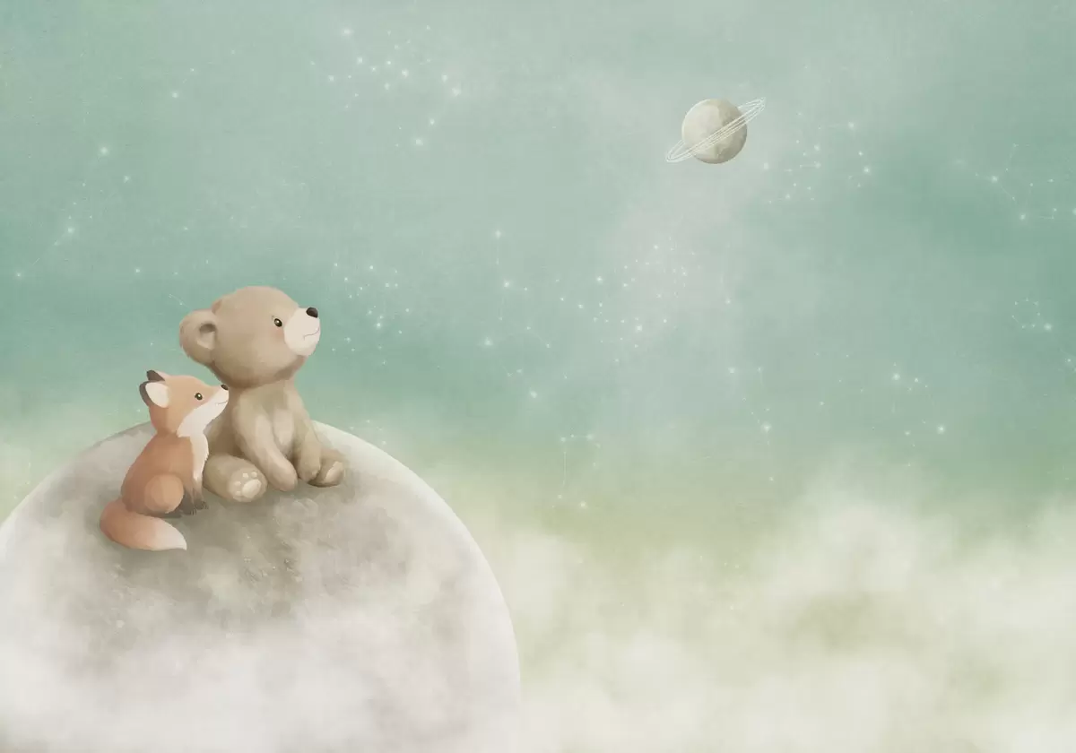 Murais de parede Ilustração em tons pastel de um urso e uma raposa contra um céu verde Nr. w05431v1