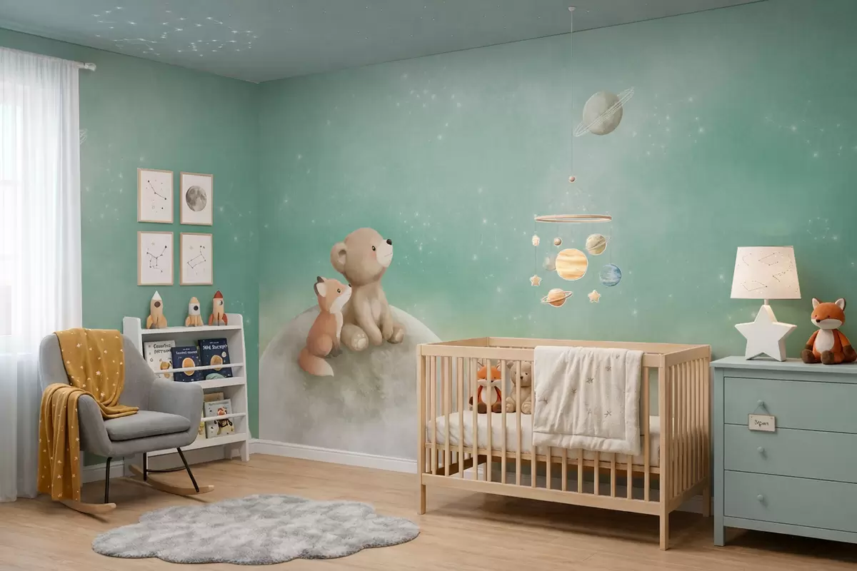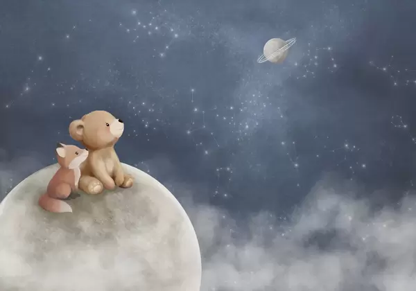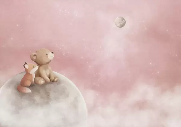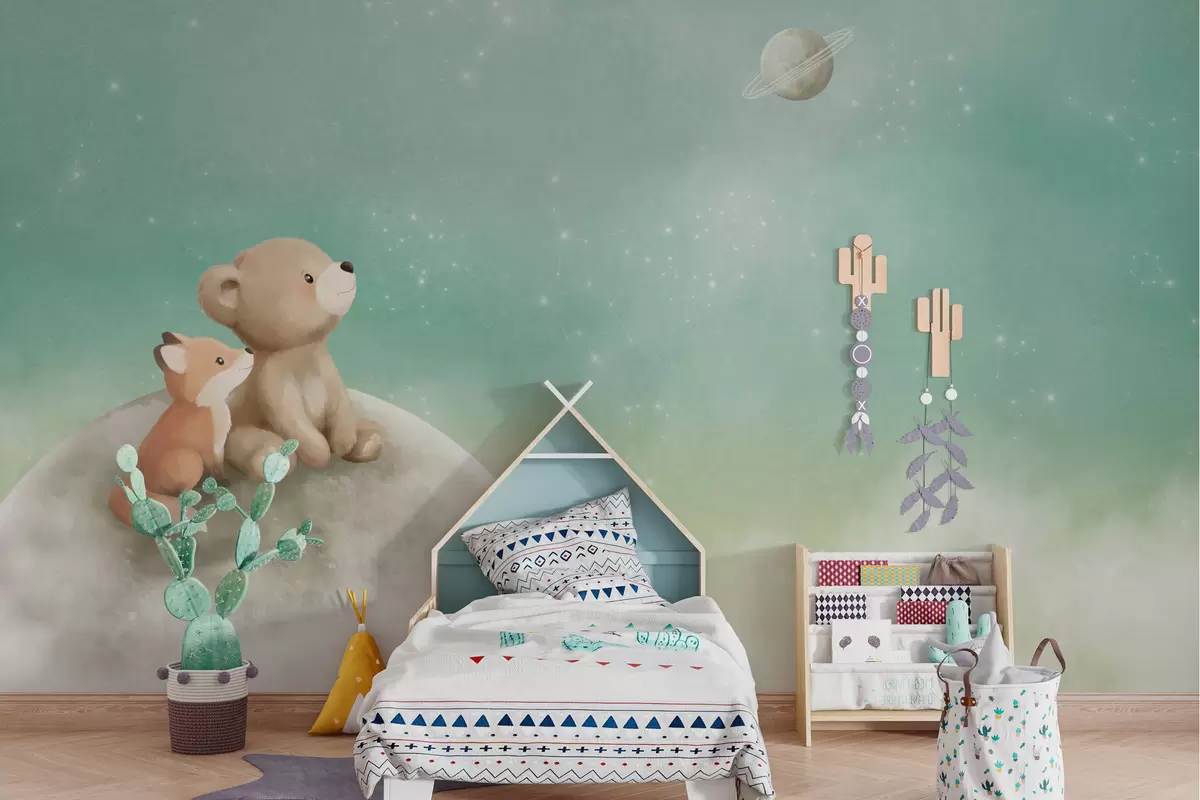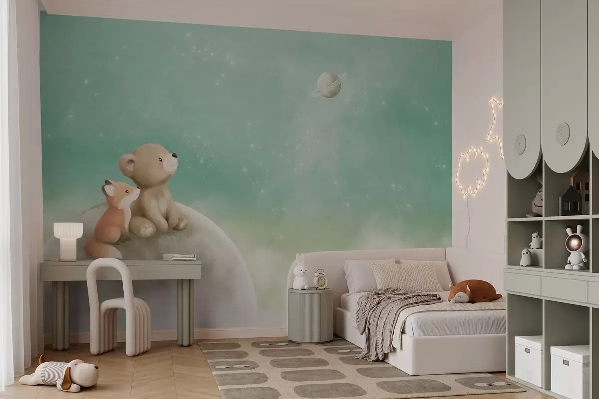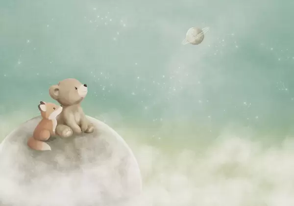 Murais de parede Ilustração em tons pastel de um urso e uma raposa contra um céu verde Nr. w05431v1