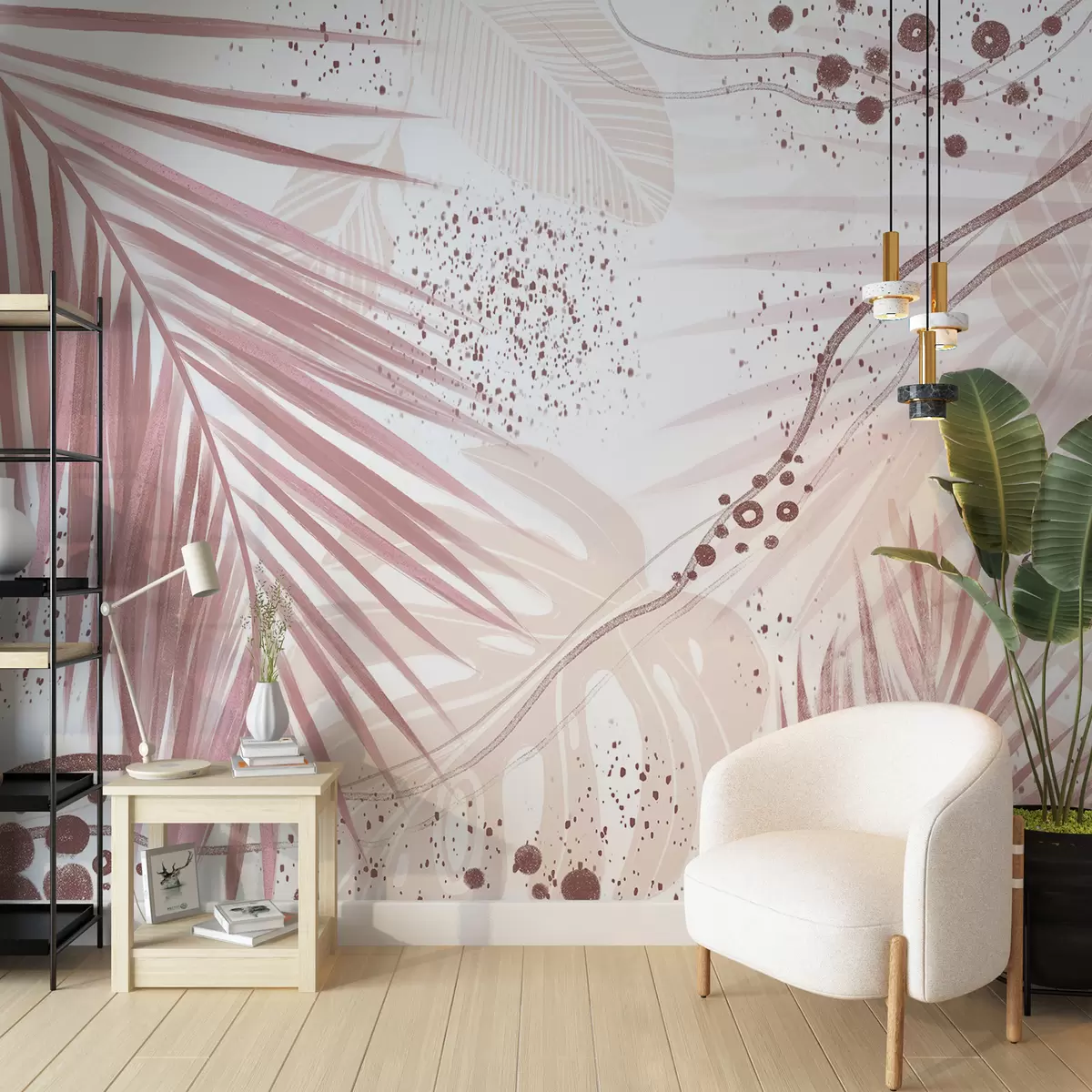 murais de parede Folhas e folhas de palmeira rosa tropical, com formas abstratas e respingos em tons de rosa e branco w07918v1