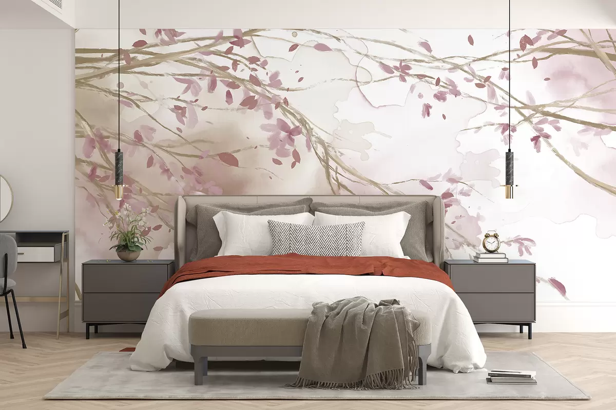 Murais de parede Delicados ramos florais rosa e brancos com fundo aquarela suave e desfocado Nr. w07919v1