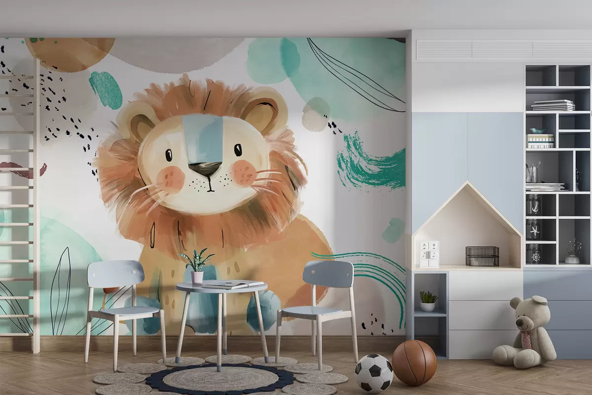 Murais de parede Um leão bonito dos desenhos animados em um fundo colorido e abstrato com pinceladas e respingos de cores pastel Nr. w07924