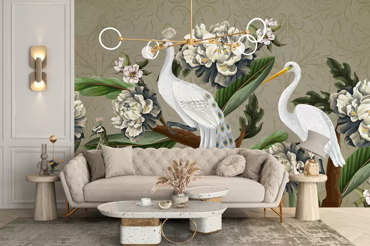 Murais de parede Um par de pavões brancos com caudas longas cercados por grandes flores brancas de peônia e folhagem verde exuberante Nr. w07975