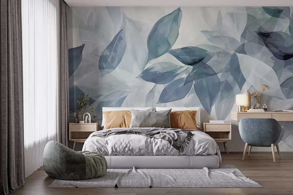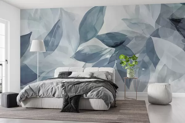 Murais de parede Folhas suaves de aquarela cinza e branca com fundo desfocado e etéreo Nr. w07981