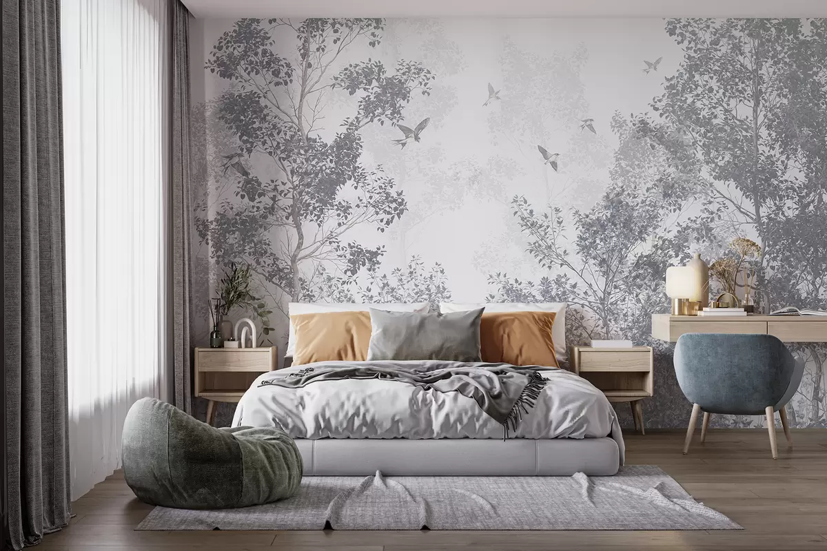 Murais de parede Árvores com folhas e ramos cinzentos com pássaros a voar no céu, fundo branco Nr. w07982v1