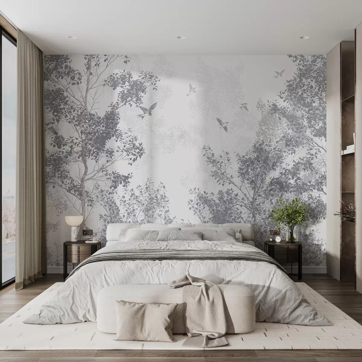 Murais de parede Árvores com folhas e ramos cinzentos com pássaros a voar no céu, fundo branco Nr. w07982v1