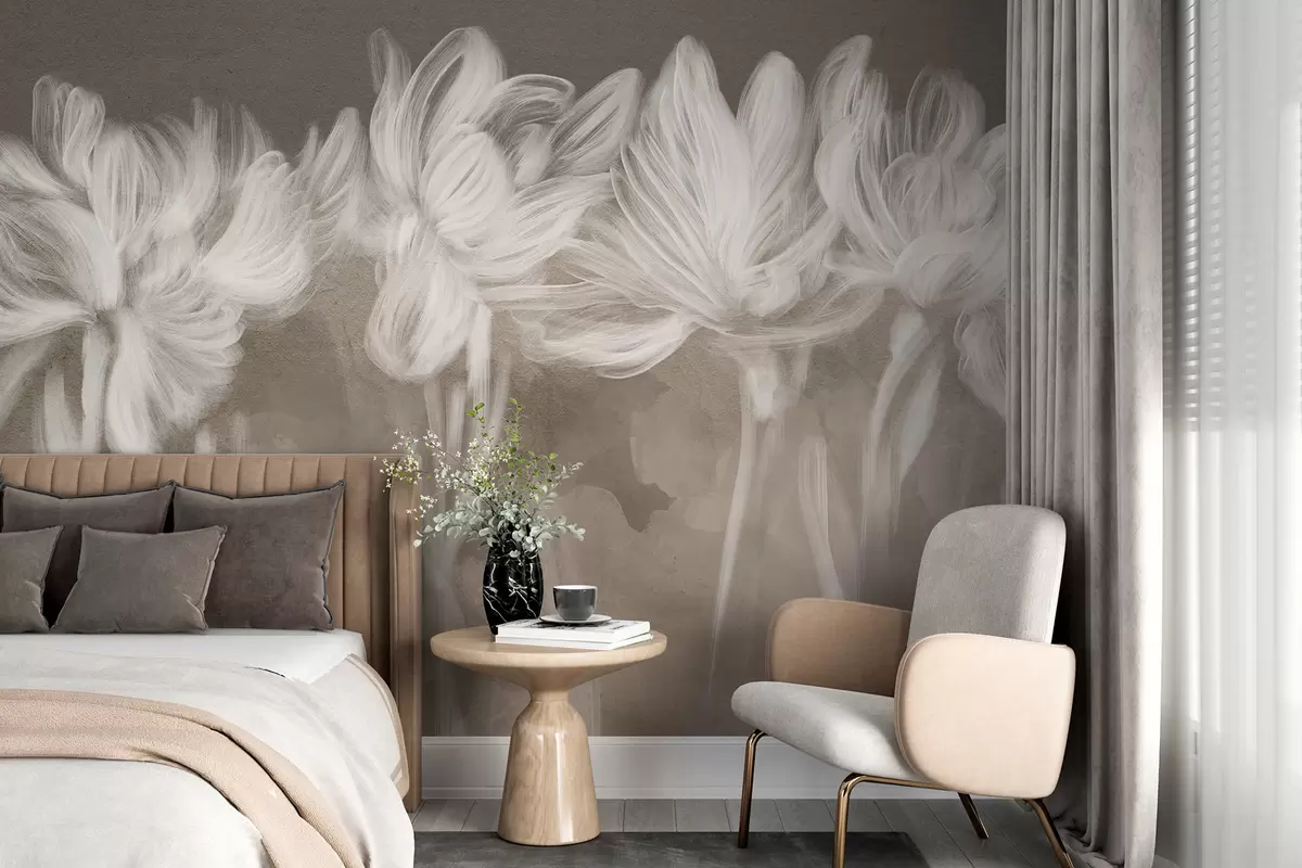 Murais de parede Silhuetas florais transparentes brancas de minimalismo suave em fundo texturizado marrom Nr. w07986