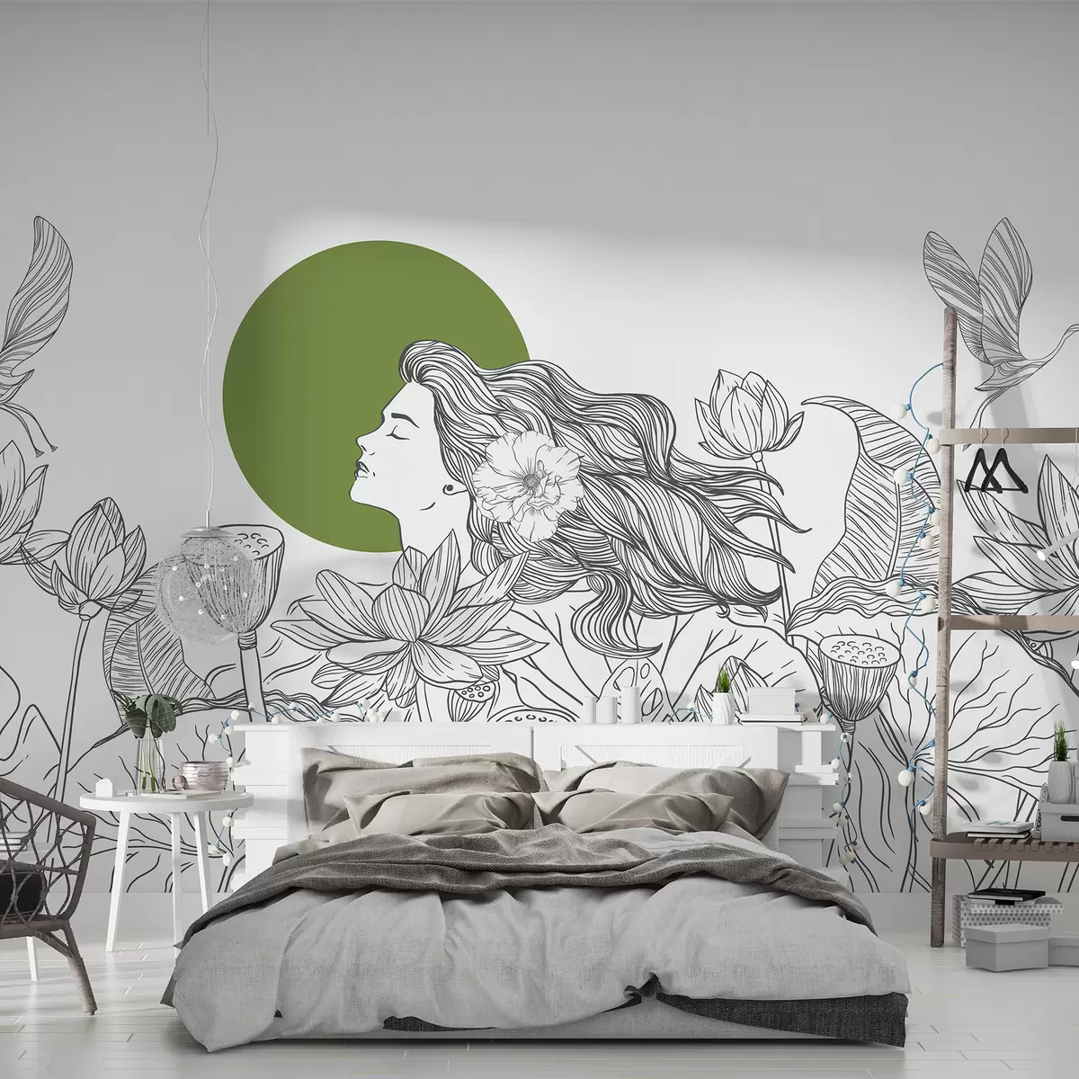 Murais de parede Mulher na natureza, desenho de linha, flores de lótus, folhas grandes, pássaros voadores, cor cinza e verde Nr. w07988v3