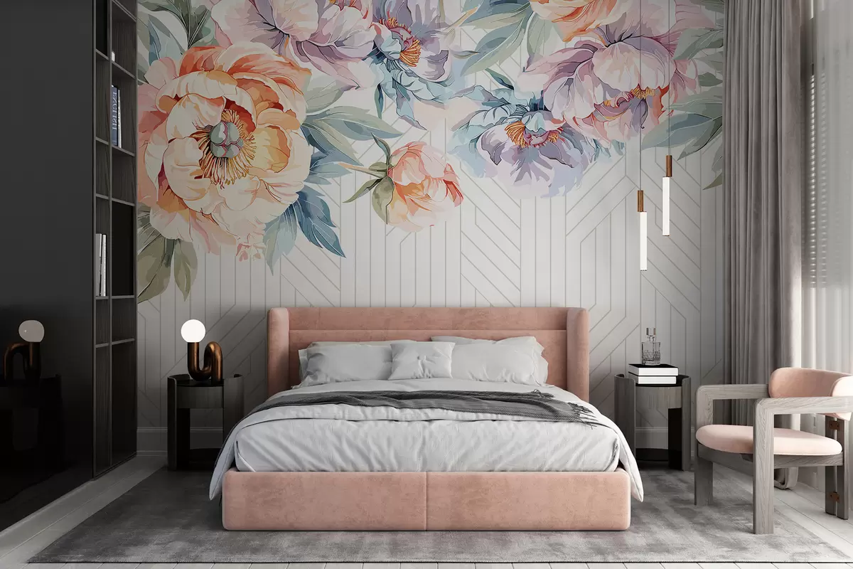 Murais de parede Peônias abstratas vibrantes de pêssego e rosa com folhas verdes sobre um fundo de padrão branco e cinza Nr. w08183