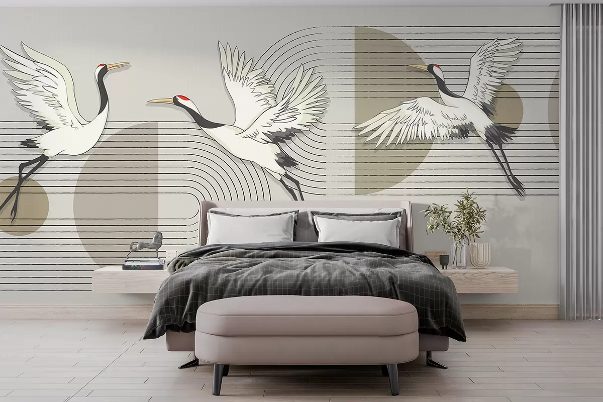 Murais de parede Três guindastes brancos em voo sobre um fundo geométrico minimalista com círculos concêntricos Nr. w08188