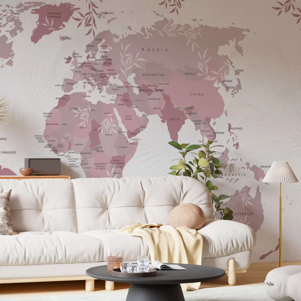 Murais de parede Mapa do mundo elegante com folhas e plantas cor-de-rosa Nr. w08211v3