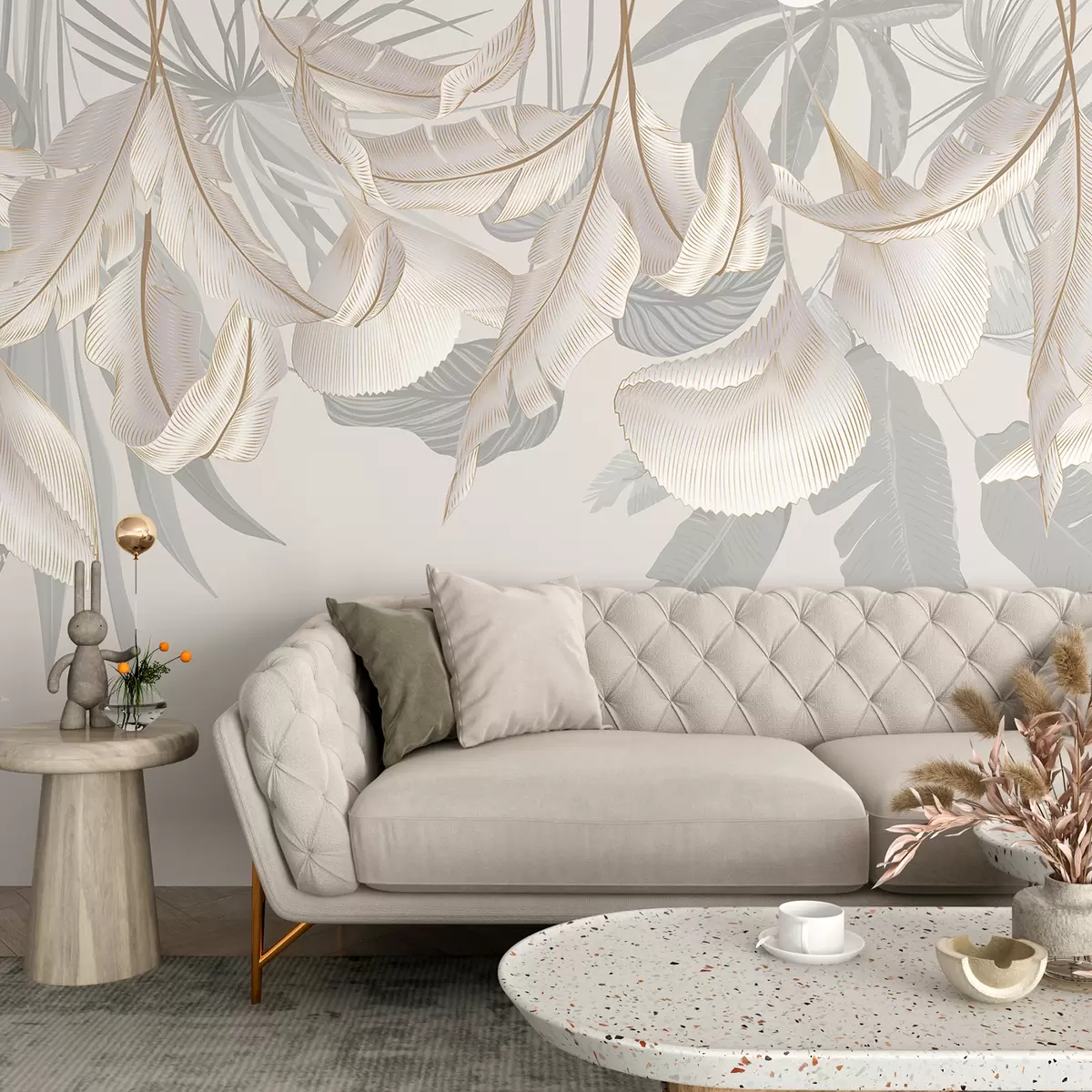 Murais de parede Delicadas folhas tropicais florais brancas e cinzas criando um fundo suave e etéreo Nr. w08217