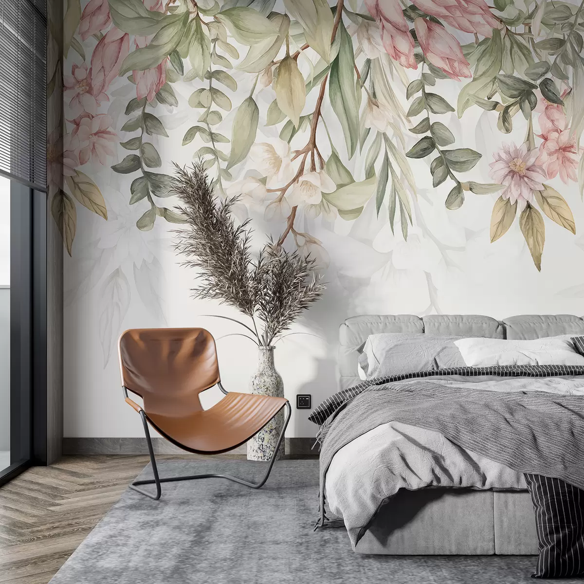 Murais de parede Flores delicadas rosa e brancas com folhas e caules verdes sobre um fundo claro Nr. w08222