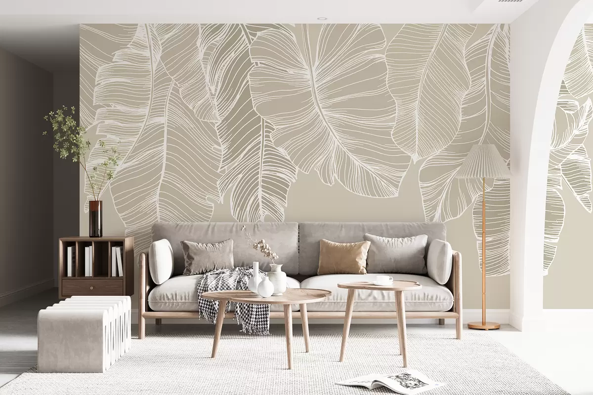 Murais de parede Folhas florais tropicais brancas com fundo bege claro, design de arte de linha minimalista Nr. w08235