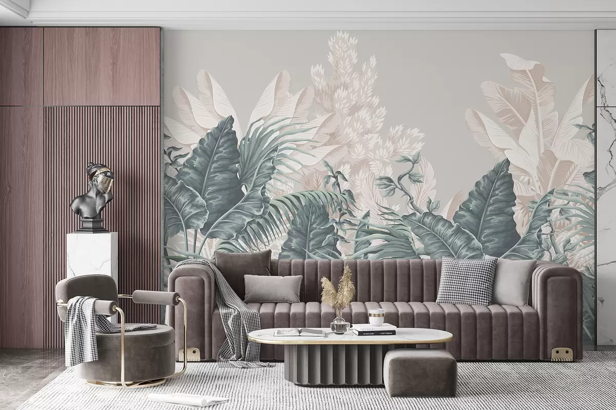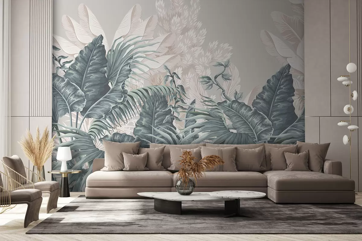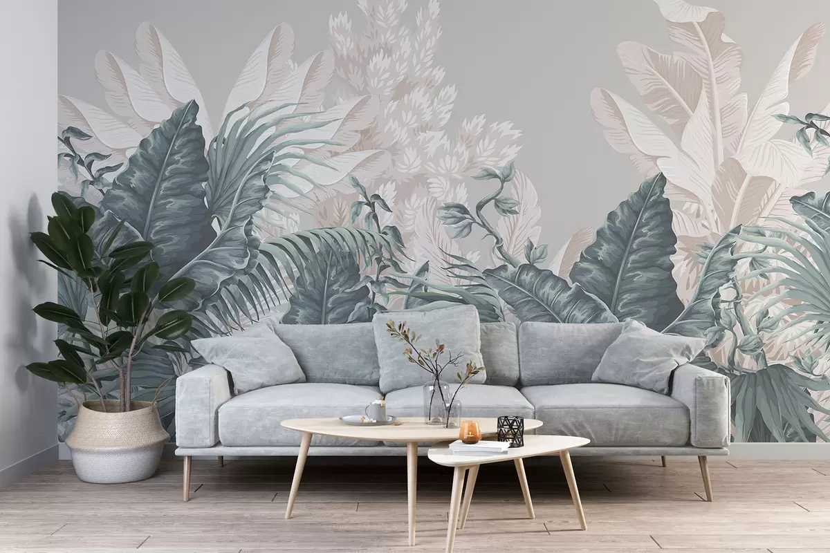 murais de parede Uma cena de selva tropical com grandes folhas verdes e flores em primeiro plano, criando uma atmosfera exuberante w08242
