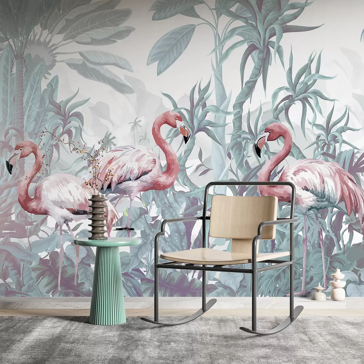 Murais de parede Flamingos cor-de-rosa numa exuberante folhagem tropical com grandes folhas de palmeira e flores em tons de verde e branco Nr. w08250v1