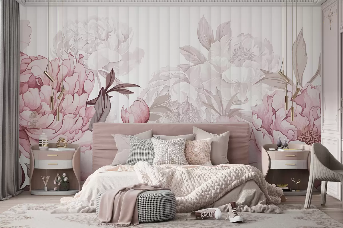 Murais de parede Um grande plano de grandes e delicadas flores de peónia cor-de-rosa e brancas sobre um fundo suave e texturado Nr. w08255