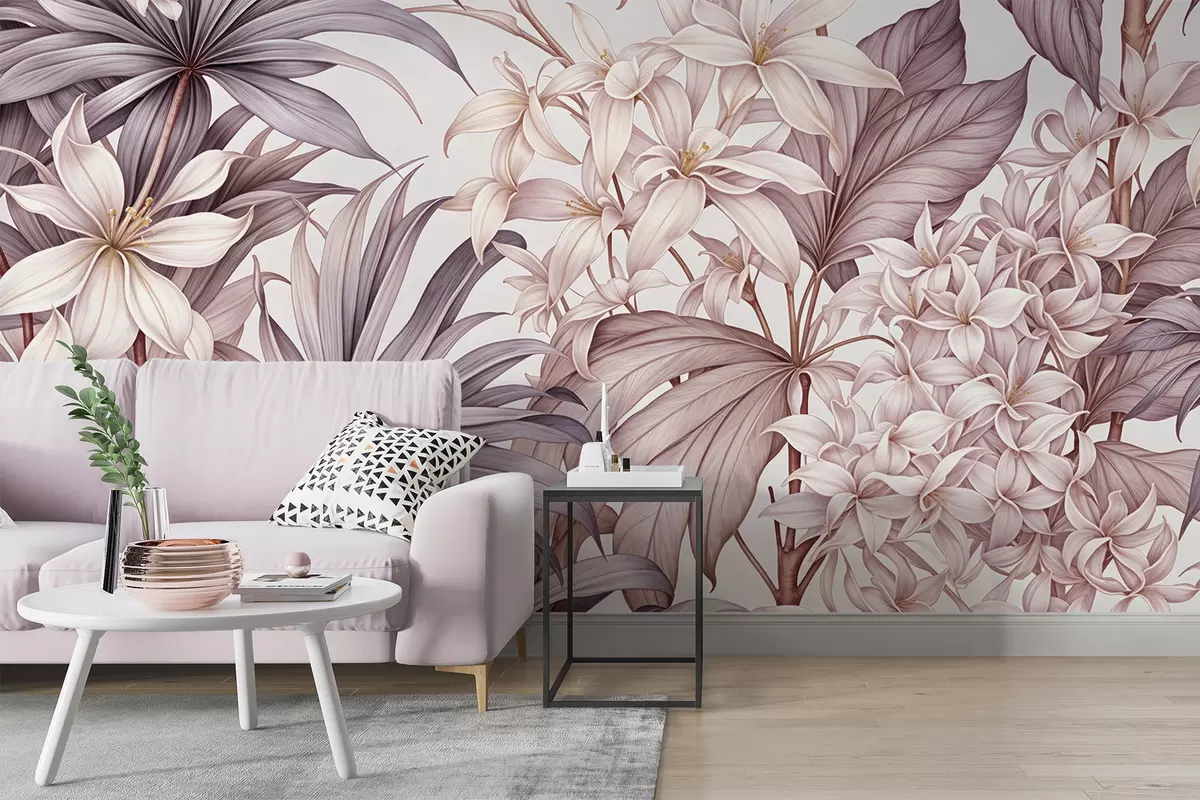 Murais de parede Um estampado floral tropical com grandes flores brancas e cor-de-rosa claro, folhas bordo e um fundo neutro Nr. w08318v1