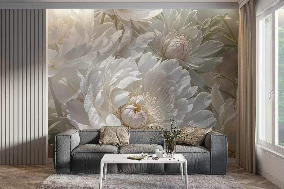 Murais de parede Grande plano de grandes e delicadas flores de peónia branca com pétalas macias e fofas e centros amarelos pálidos Nr. w08325