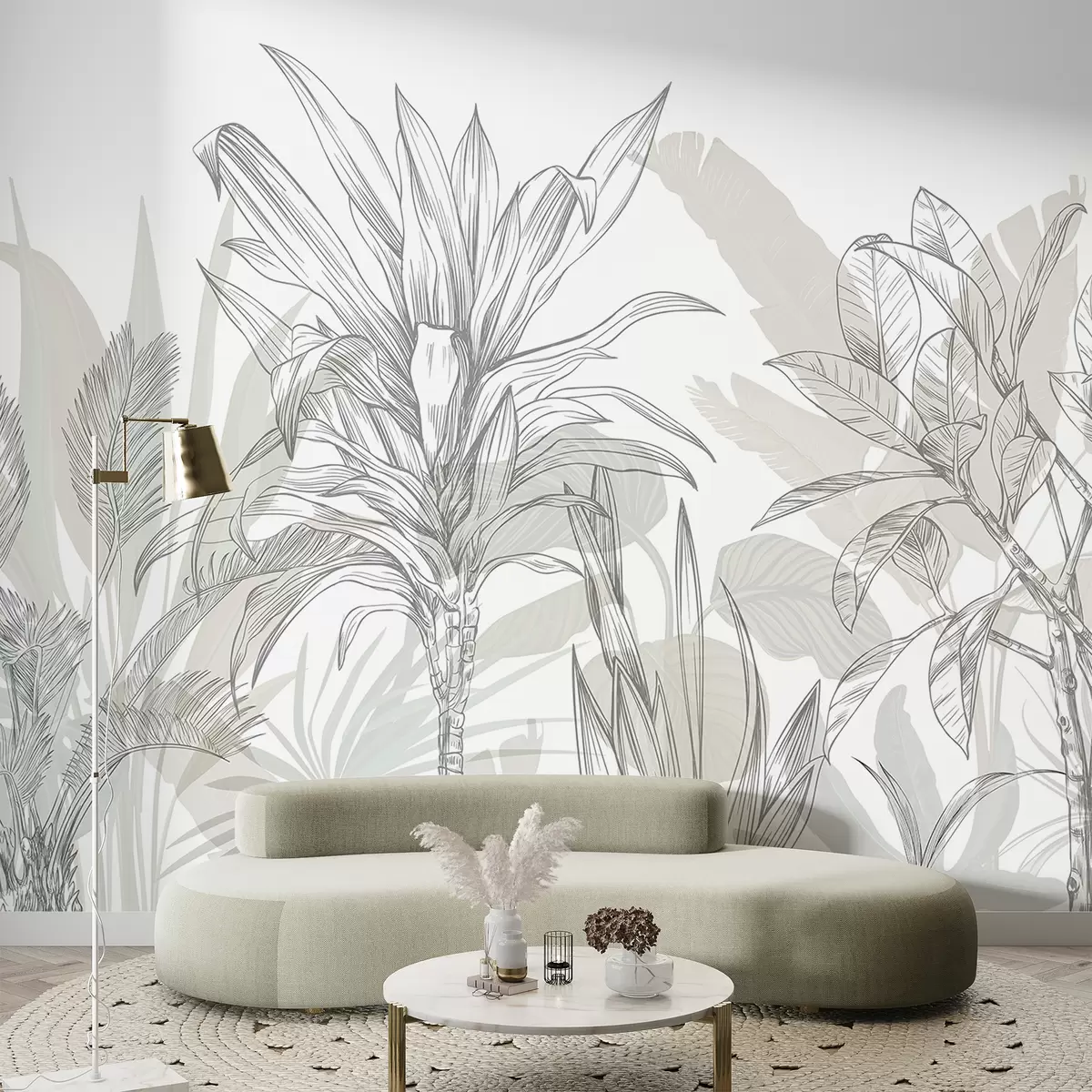 Murais de parede Plantas gráficas tropicais com folhas e flores grandes e exuberantes em tons de cinzento e branco com silhuetas verdes florais Nr. w08327