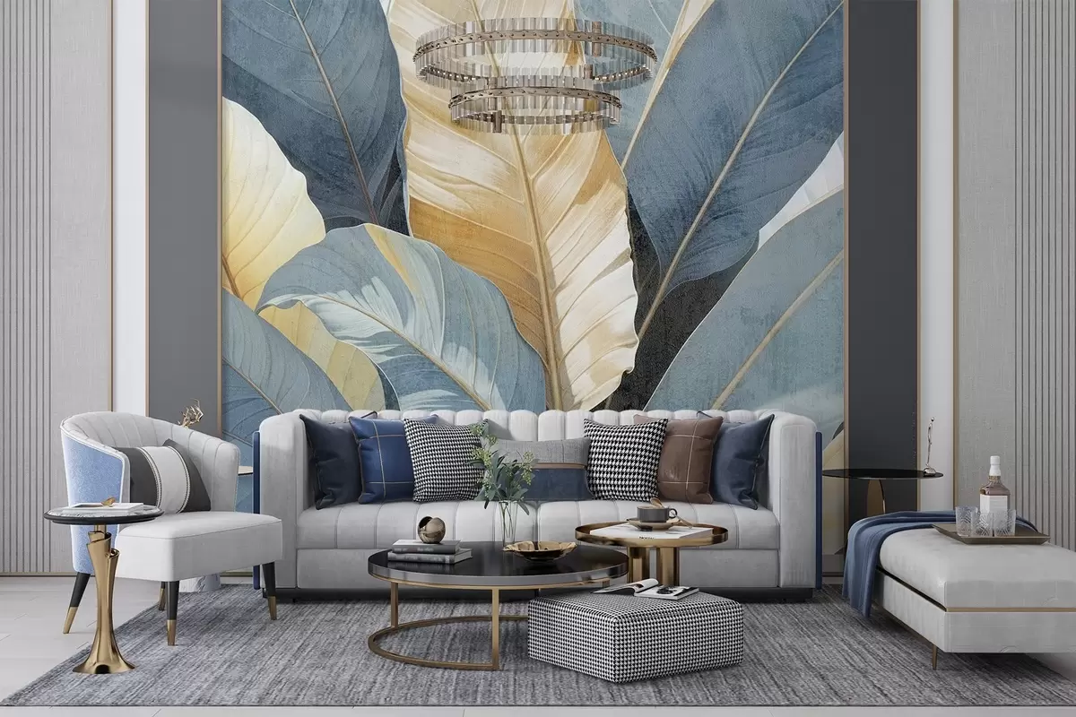 Murais de parede Uma vista de perto de grandes folhas tropicais decorativas, exuberantes e texturadas, em tons de azul, verde e amarelo Nr. w08373