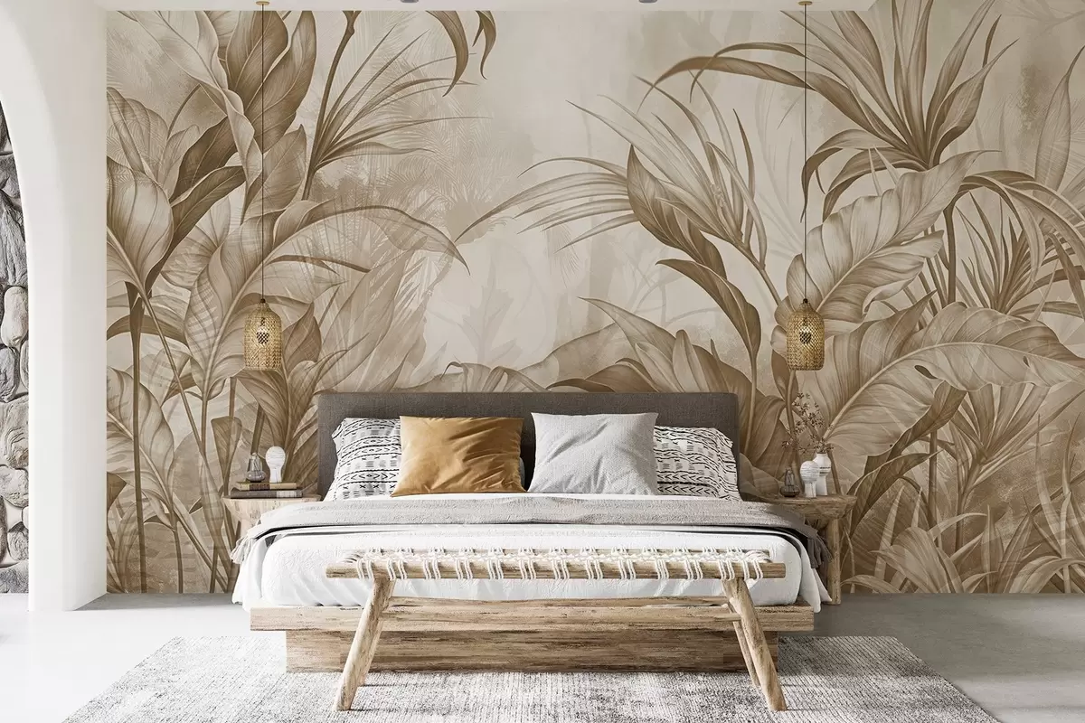 Murais de parede Selva tropical com grandes flores de protea castanhas e bege com fundo texturado esbatido Nr. w08375v2