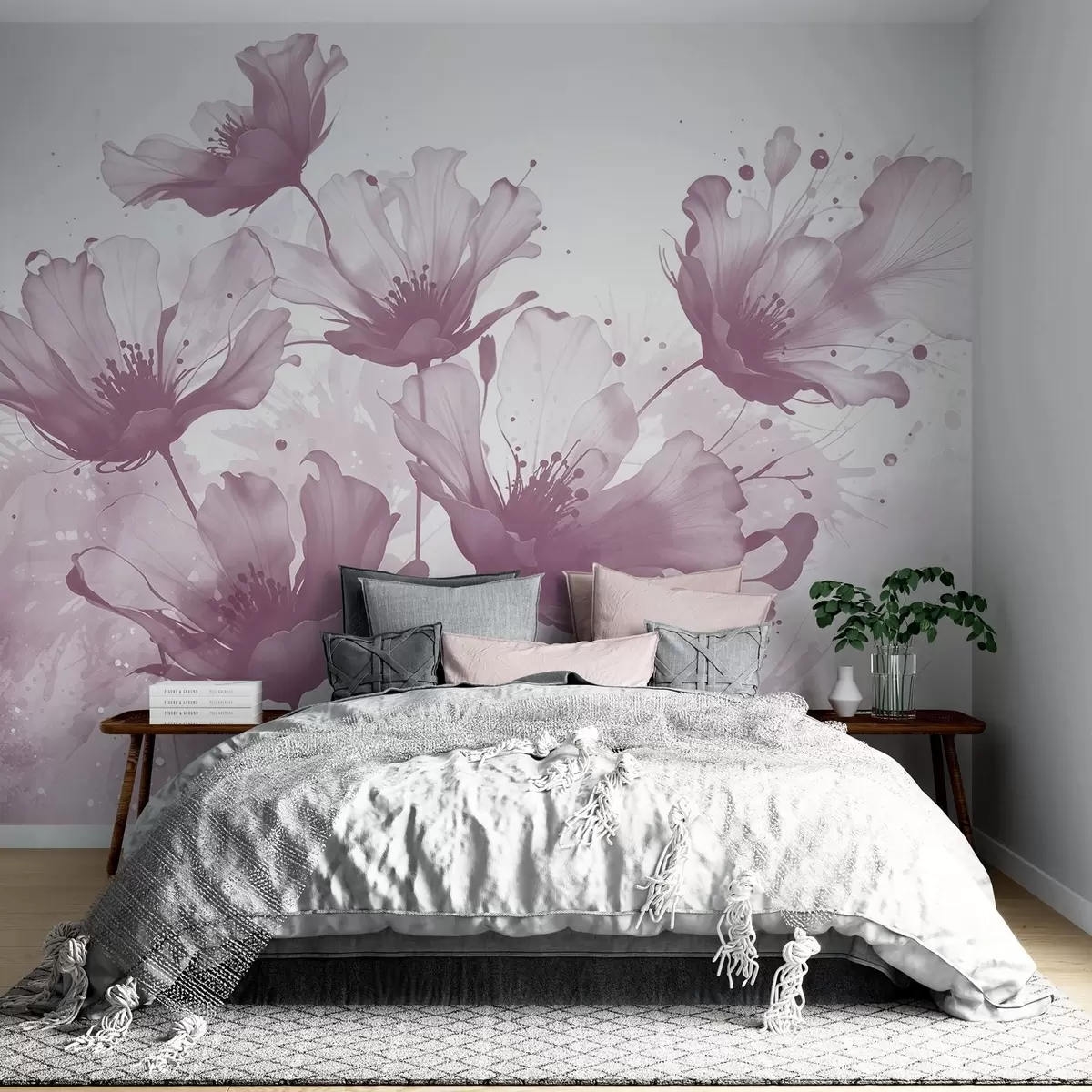 Murais de parede Delicadas flores cor-de-rosa com pétalas suaves e esbatidas e salpicos de aguarela sobre um fundo claro Nr. w08376v2
