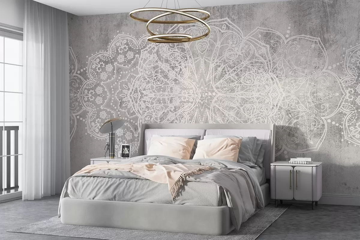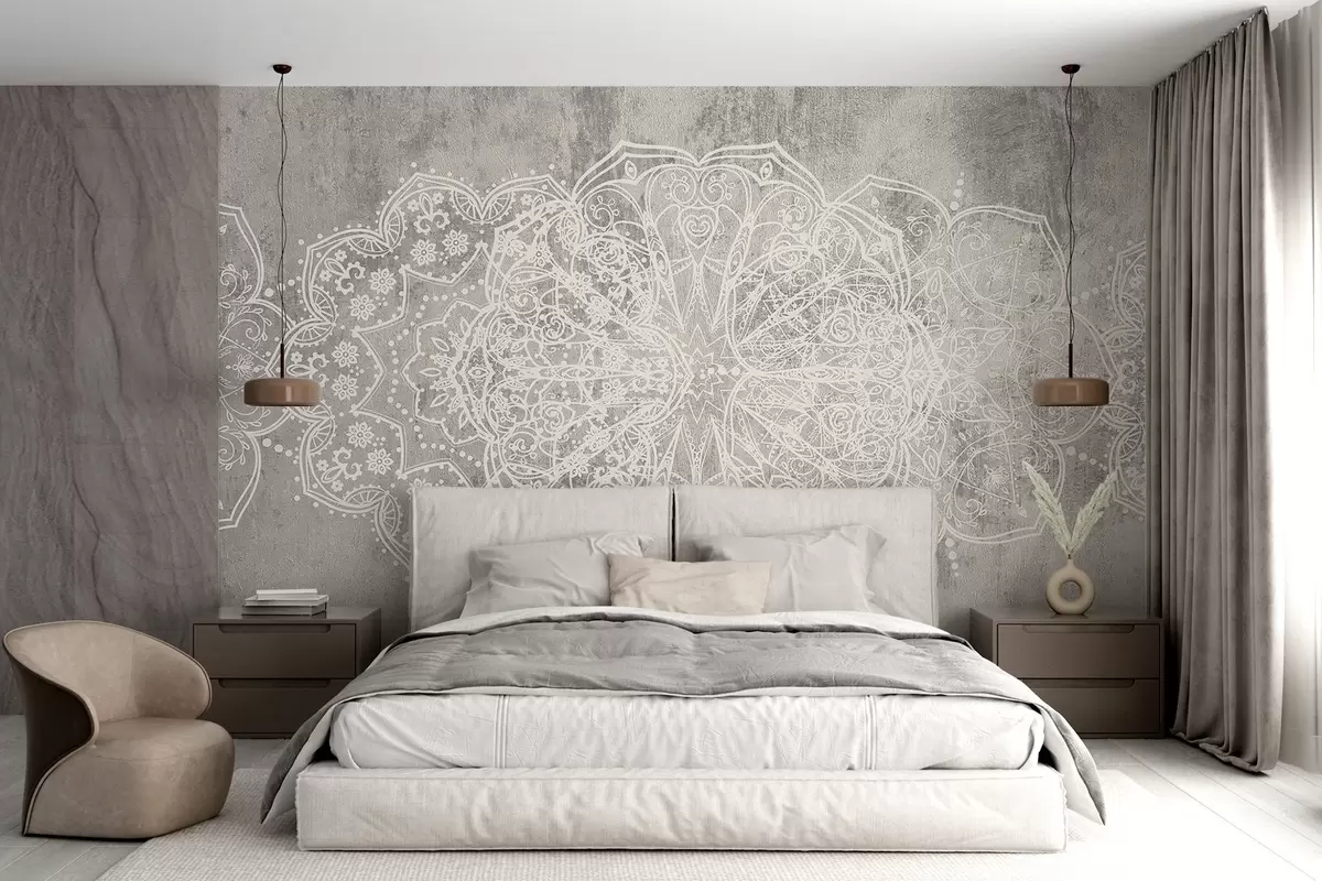 Murais de parede Um padrão de mandala de renda branca intrincado e detalhado num fundo de parede cinzento texturizado Nr. w08387