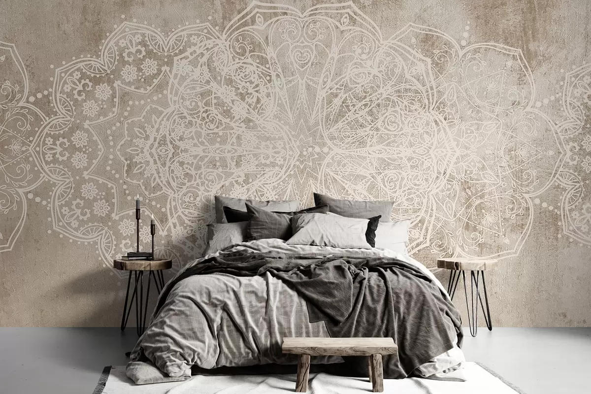Murais de parede Um padrão de mandala de renda branca intrincado e detalhado sobre um fundo de parede bege-castanho texturizado Nr. w08387v1