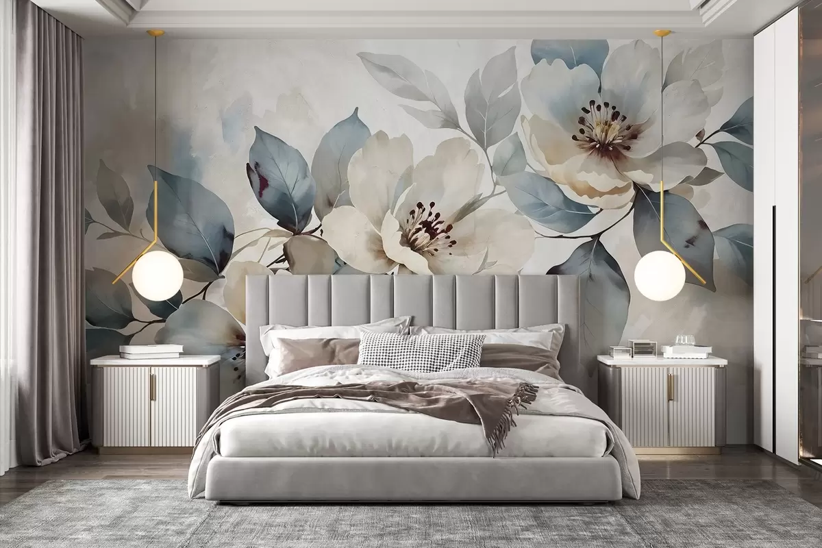 Murais de parede Delicado arranjo floral branco e azul com textura de aguarela, com pétalas e centros suaves Nr. w08401