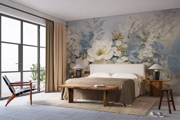 murais de parede Grandes flores brancas e amarelas pálidas com textura e folhas verde-acinzentadas num fundo suave e desfocado w08404