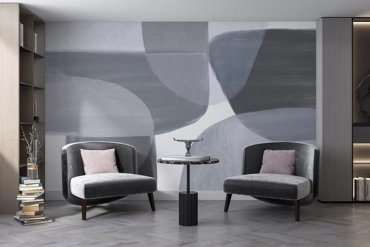 Murais de parede Uma impressão abstrata monocromática com formas minimalistas sobrepostas e formas em tons de cinzento e azul Nr. w08410