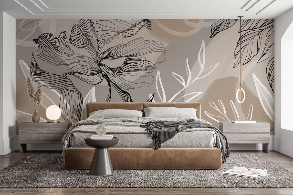 Murais de parede Estampado floral elegante com grandes flores e folhas abstractas em tons de cinzento e bege sobre um fundo claro Nr. w08413