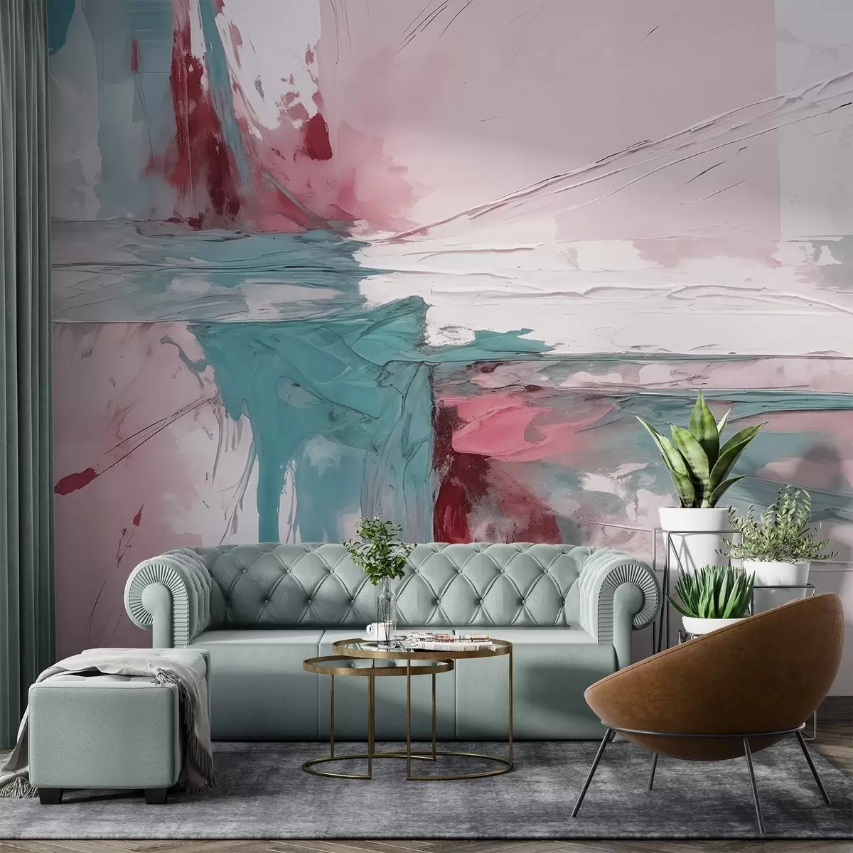 murais de parede Composição de arte abstrata minimalista com pinceladas arrojadas de tinta rosa, azul e branca  w08414v1
